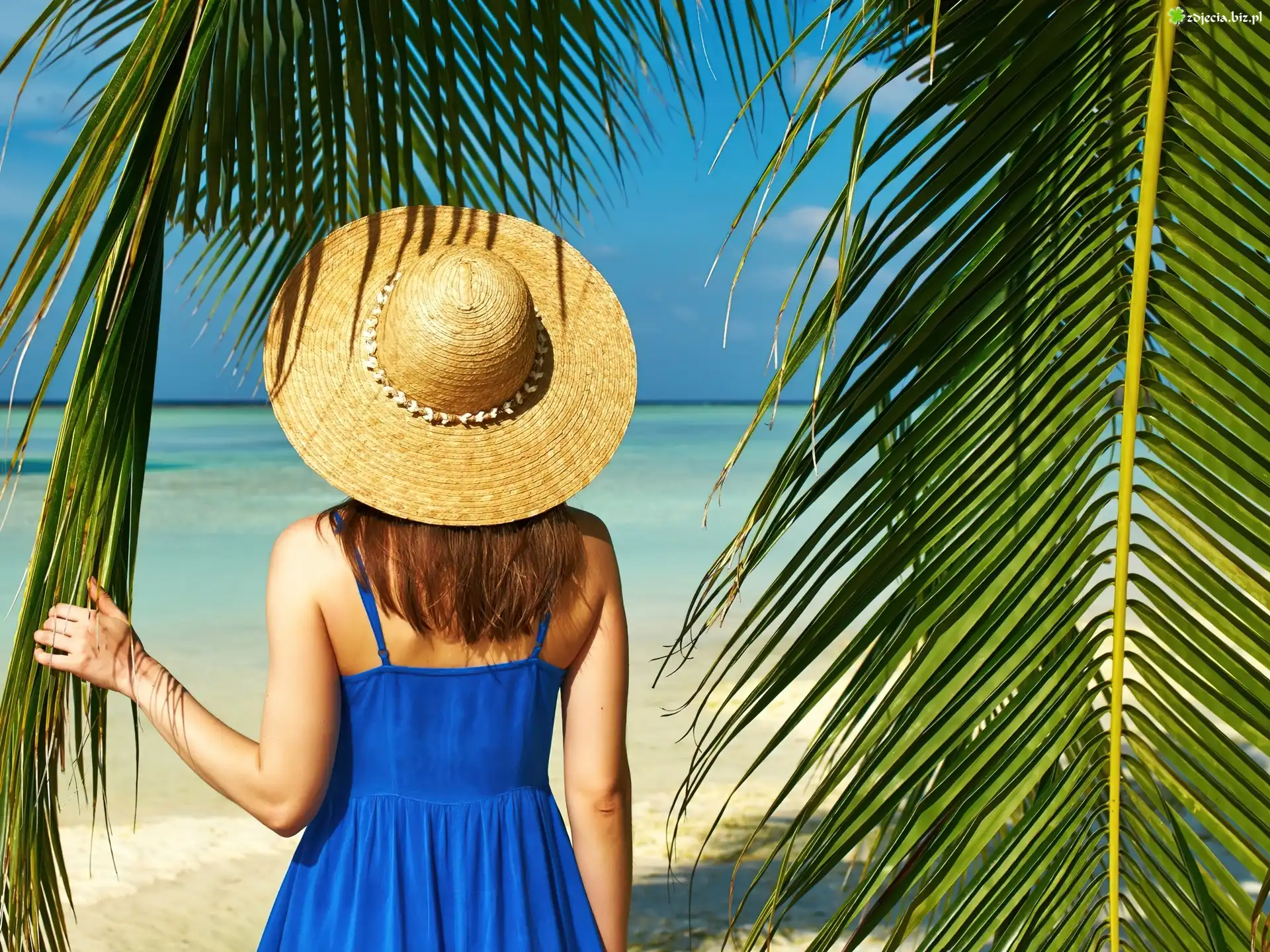 Zdjęcie Kobieta, Kapelusz, Palmy, Plaża, Morze, Tropiki