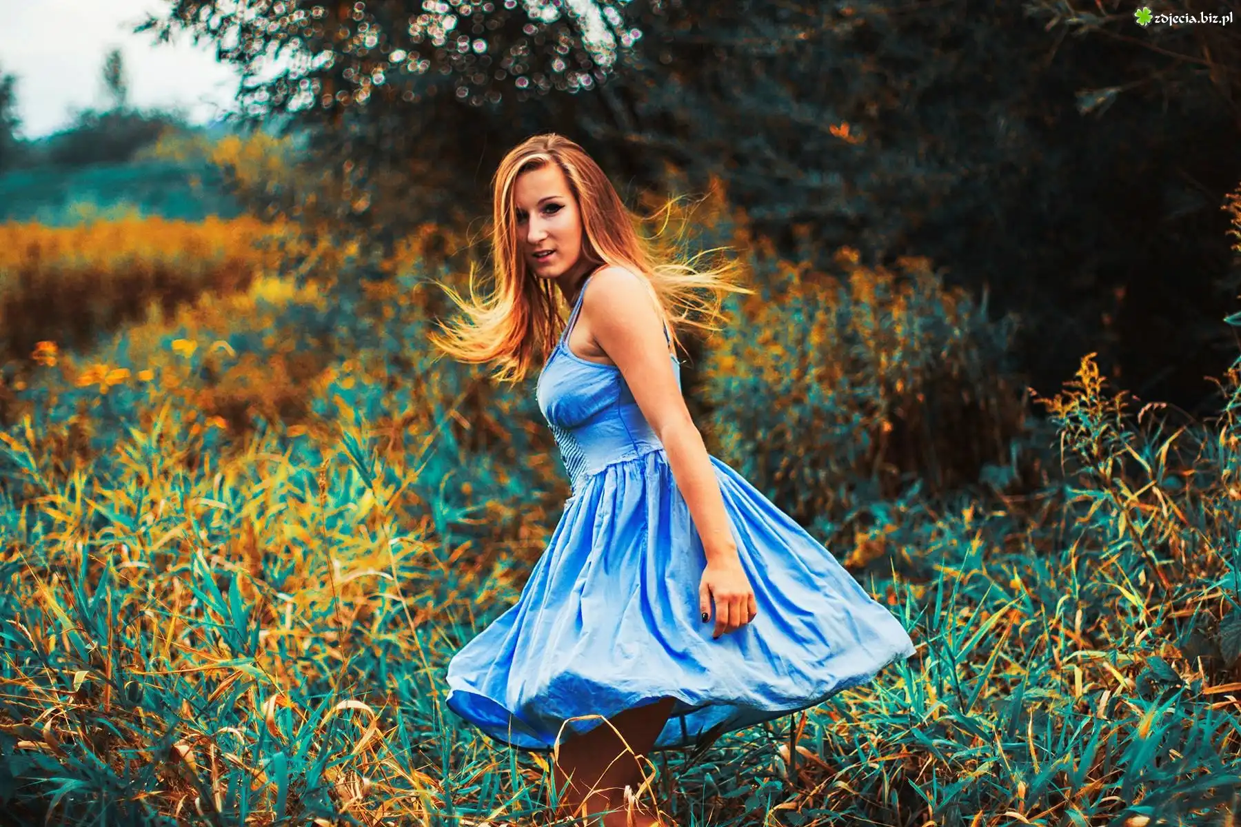 Zdjęcie, Kobieta, Blondynka, Niebieska, Sukienka