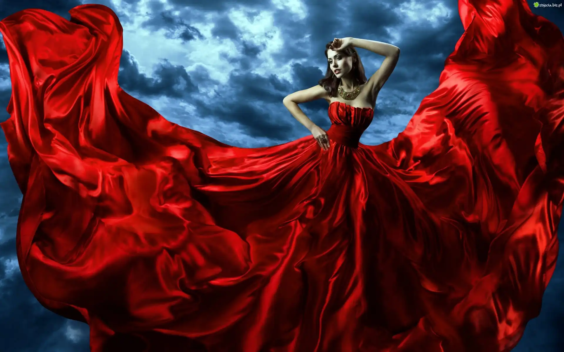 Zdjęcie Kobieta, Czerwona, Suknia, Niebo, Chmury