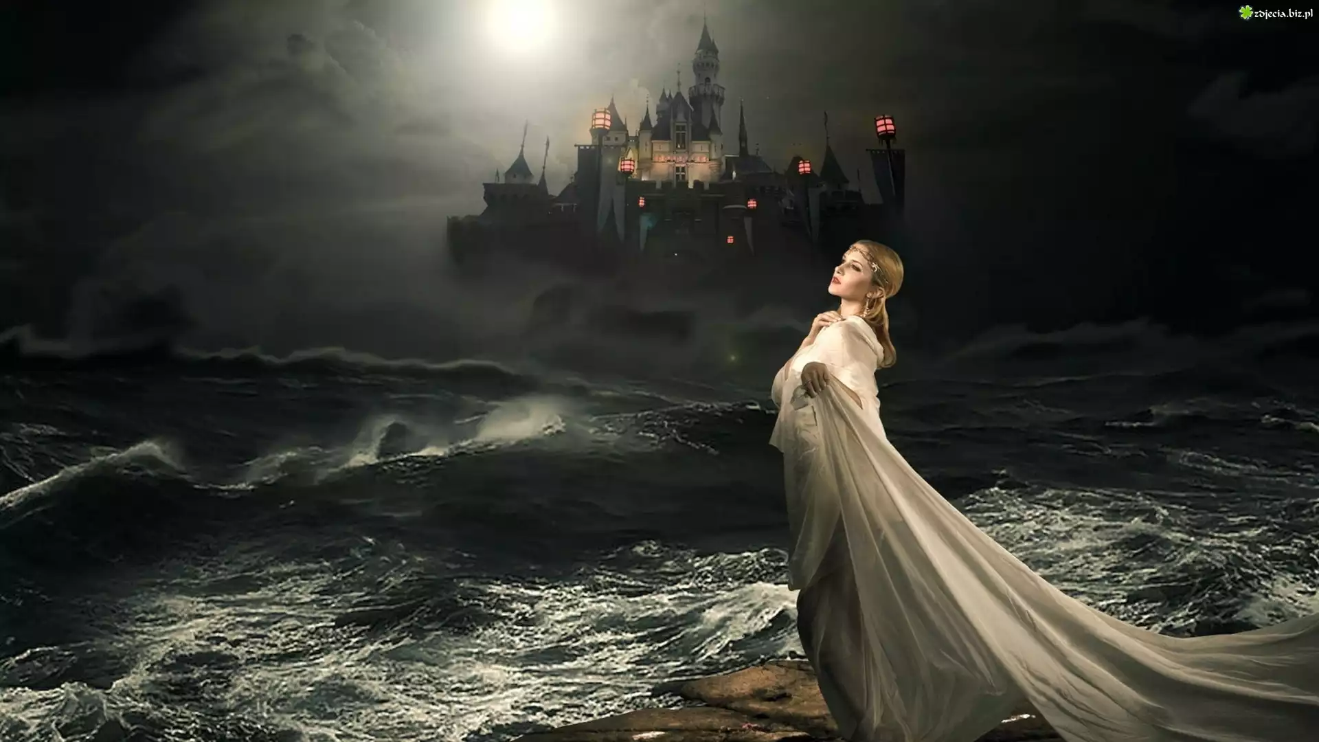 Zdjęcie Kobieta, Morze, Noc, Zamek