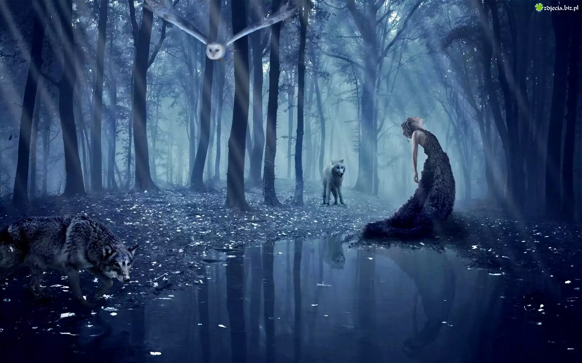 Zdjęcie Kobieta, Drzewa, Wilki, Sowa, Odbicie, Woda
