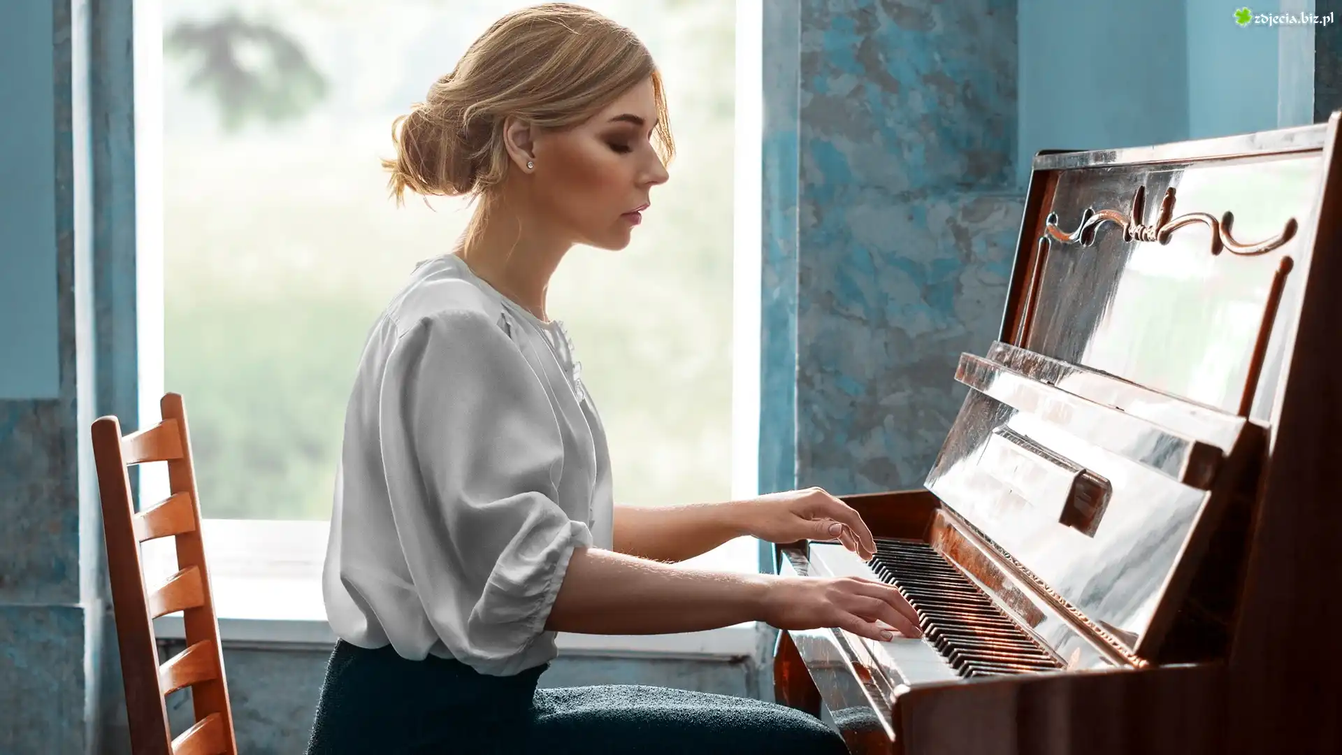 Zdjęcie Kobieta, Blondynka, Pianino, Okno, Krzesło