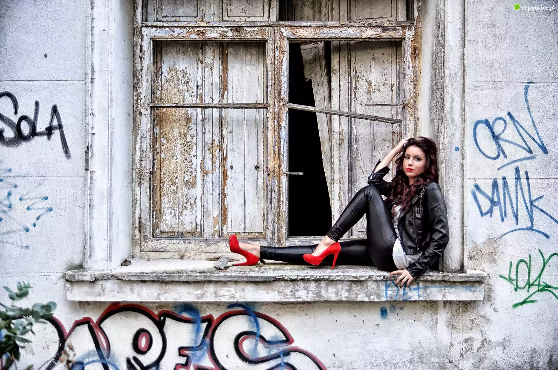 Zdjęcie Kobieta, Skórzane, Ubranie, Szpilki, Okno, Graffiti
