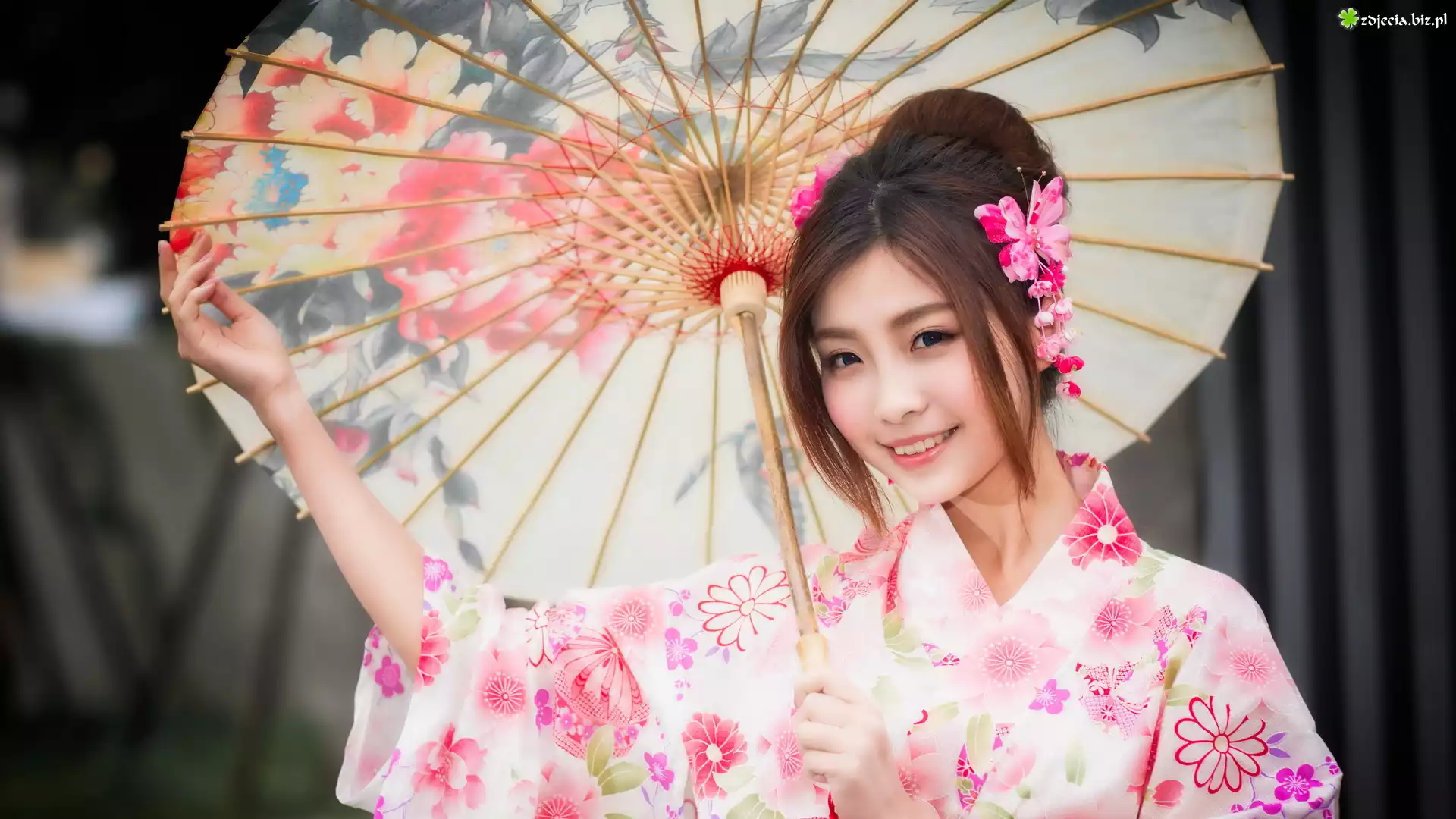 Zdjęcie Kobieta, Japonka, Kimono, Parasolka, Uśmiech