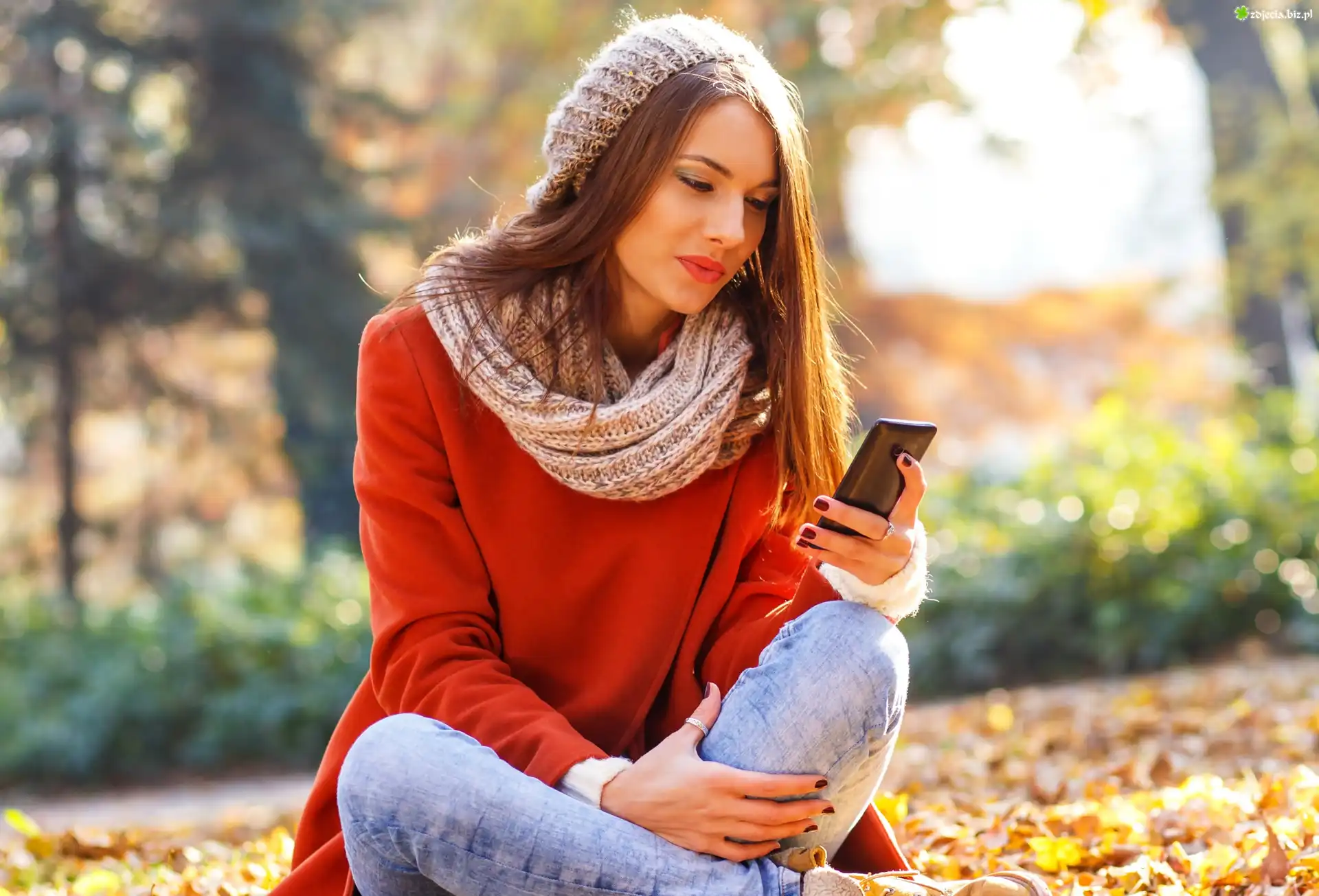 Zdjęcie Kobieta, Telefon, Liście, Drzewa, Park, Jesień