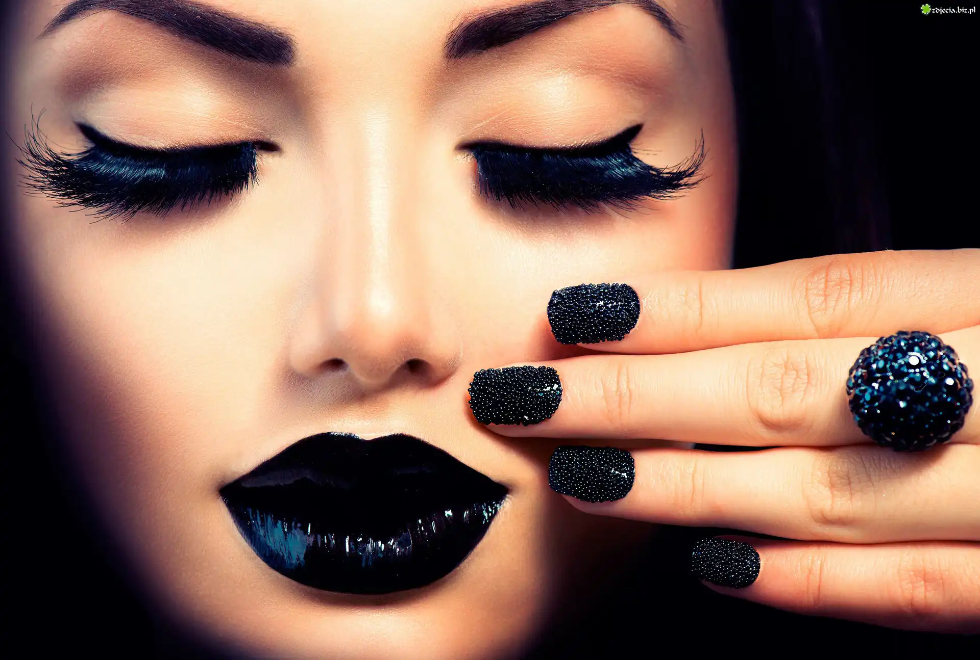 Zdjęcie Kobieta, Makijaż, Czarne, Usta, Paznokcie, Pierścionek