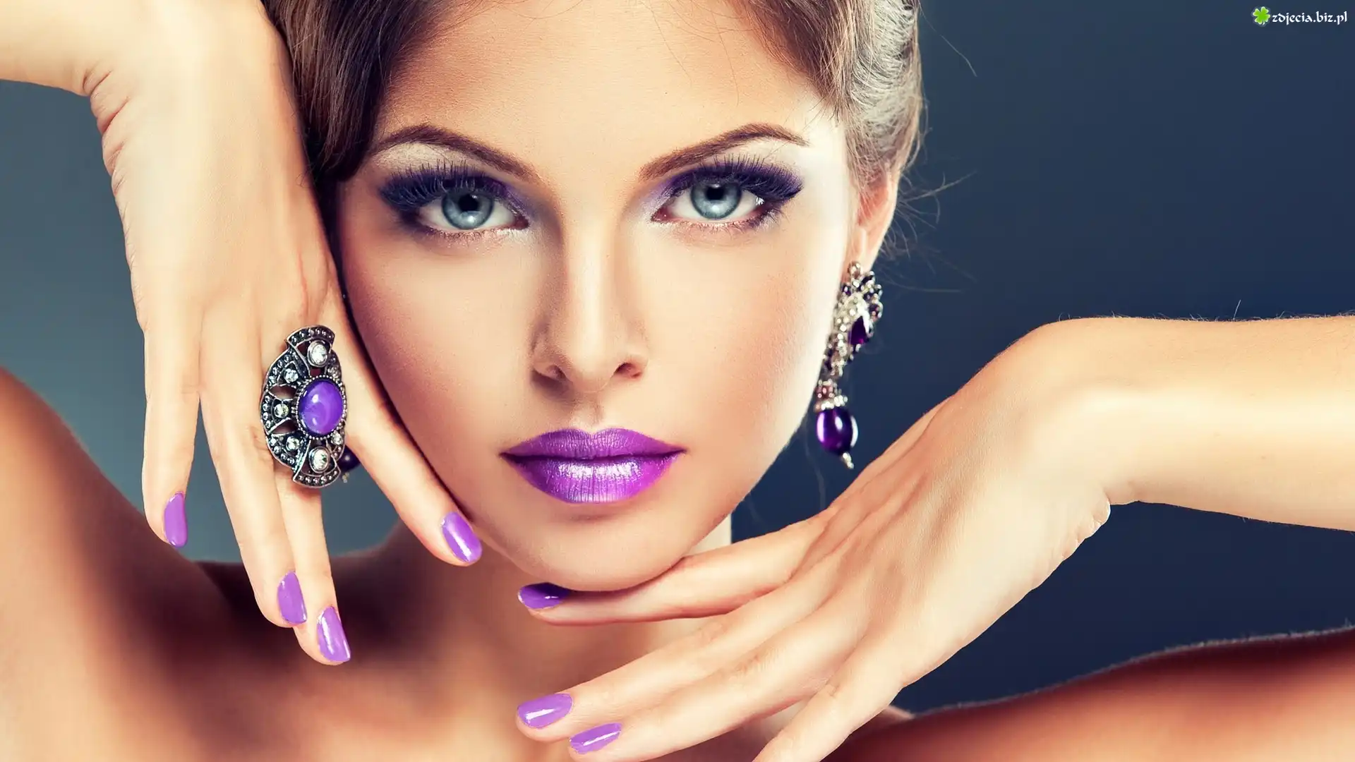 Zdjęcie Kobieta, Fioletowy, Makijaż, Paznokcie, Pierścionek, Kolczyki