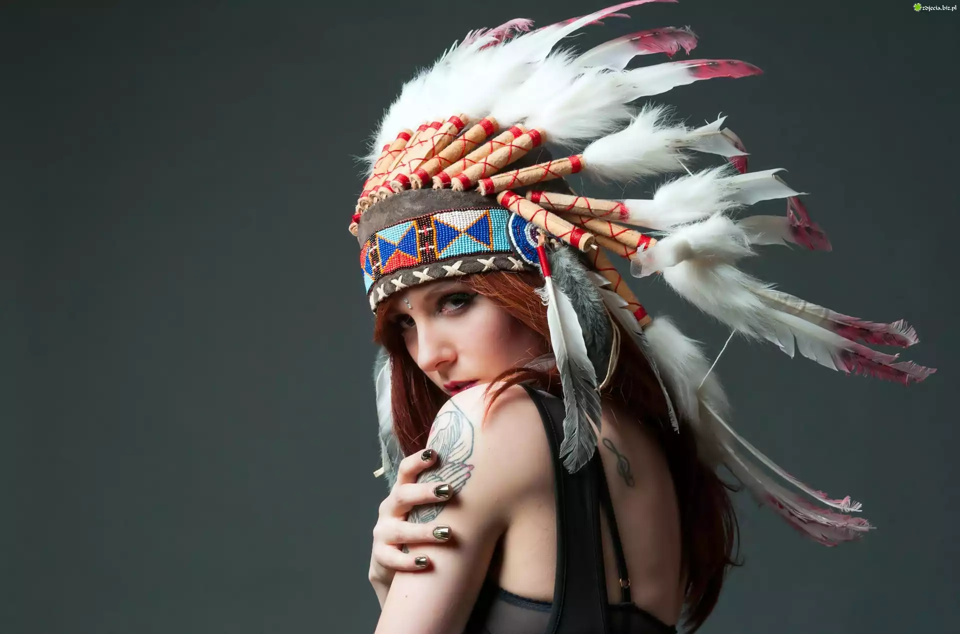 Zdjęcie, Kobieta, Indianka, Pióropusz, Tatuaż