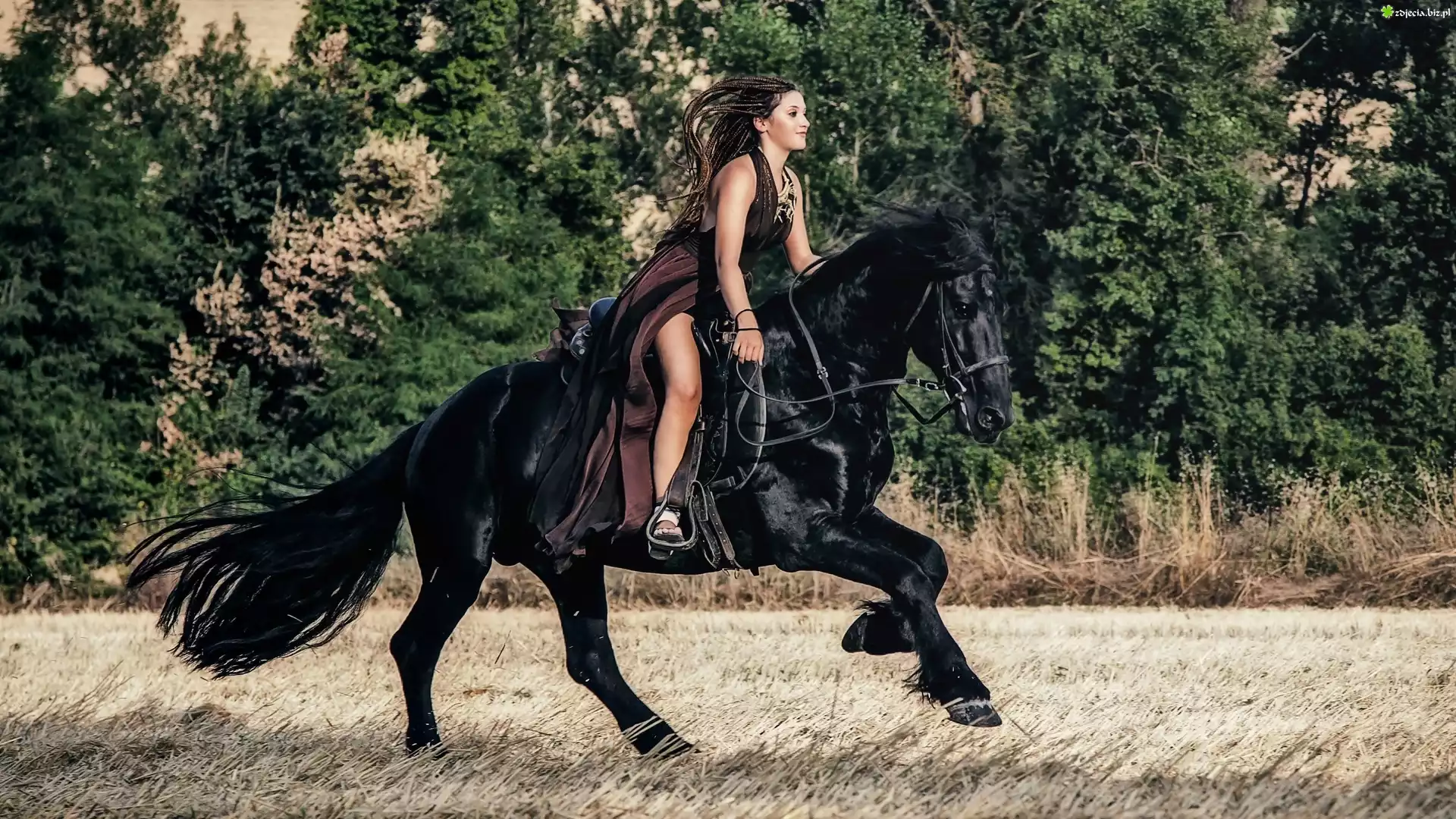 Zdjęcie Kobieta, Kary, Koń, Pole, Drzewa
