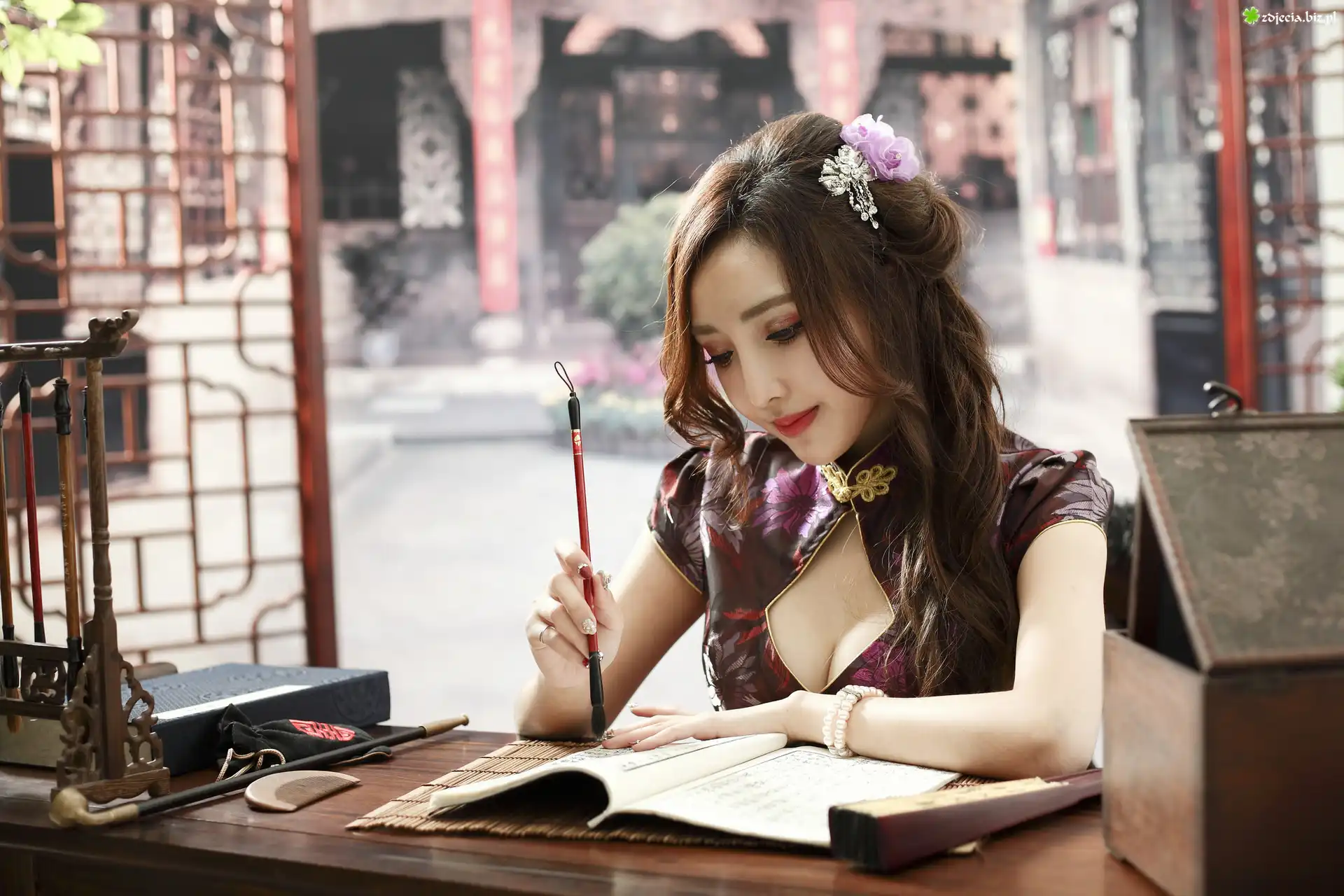Zdjęcie, Kobieta, Azjatka, Biurko, Rozmyte tło