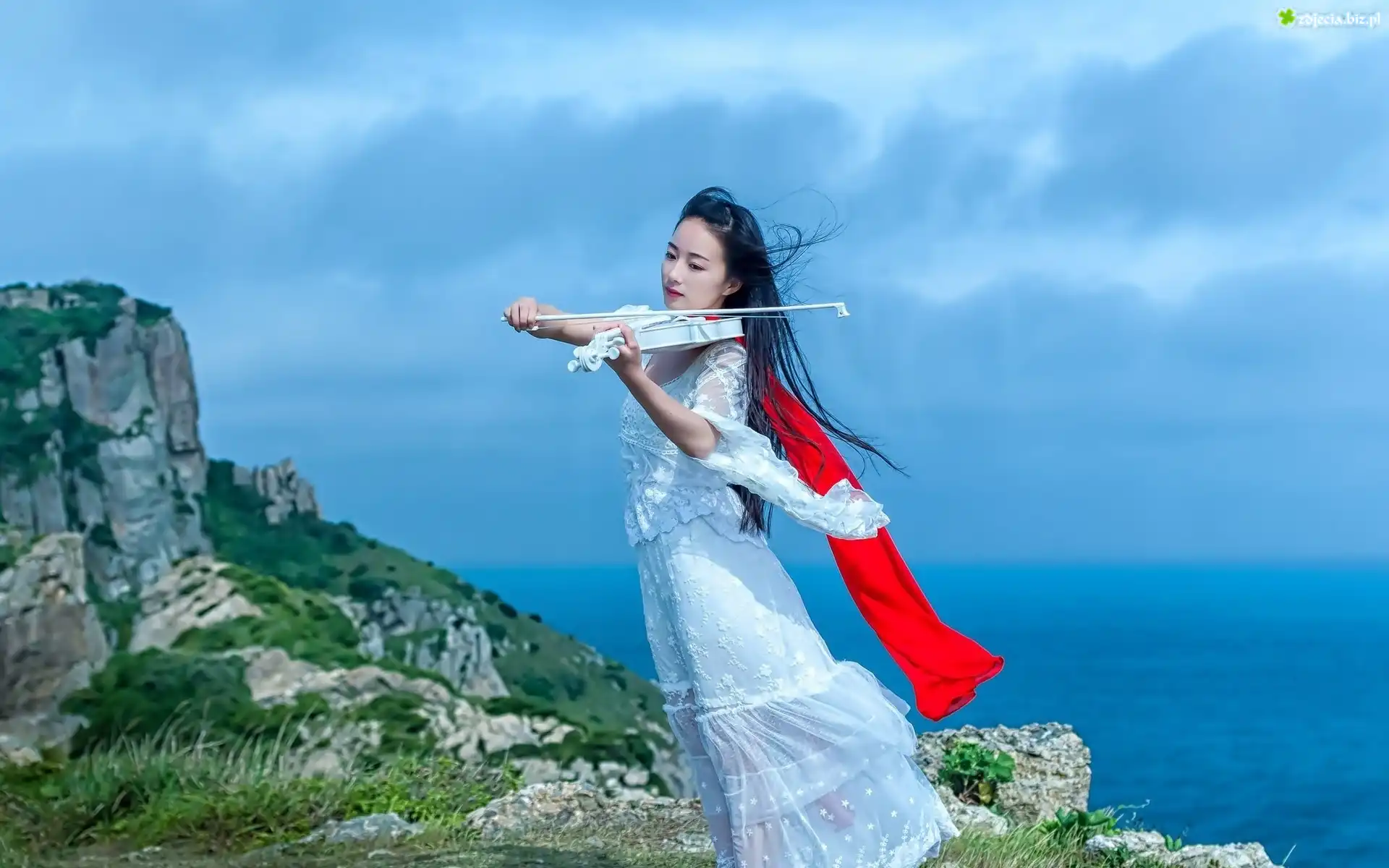 Zdjęcie Kobieta, Azjatka, Skrzypce, Wybrzeże, Skały, Morze