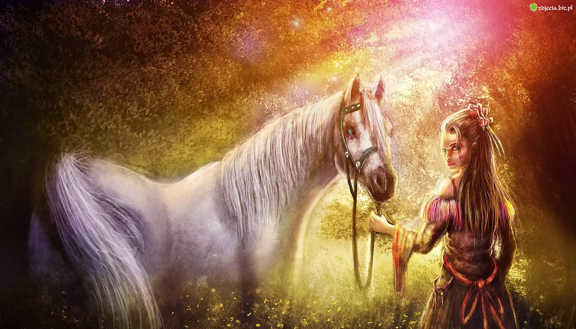 Zdjęcie Kobieta, Koń, Promienie, Słońca, Łąka