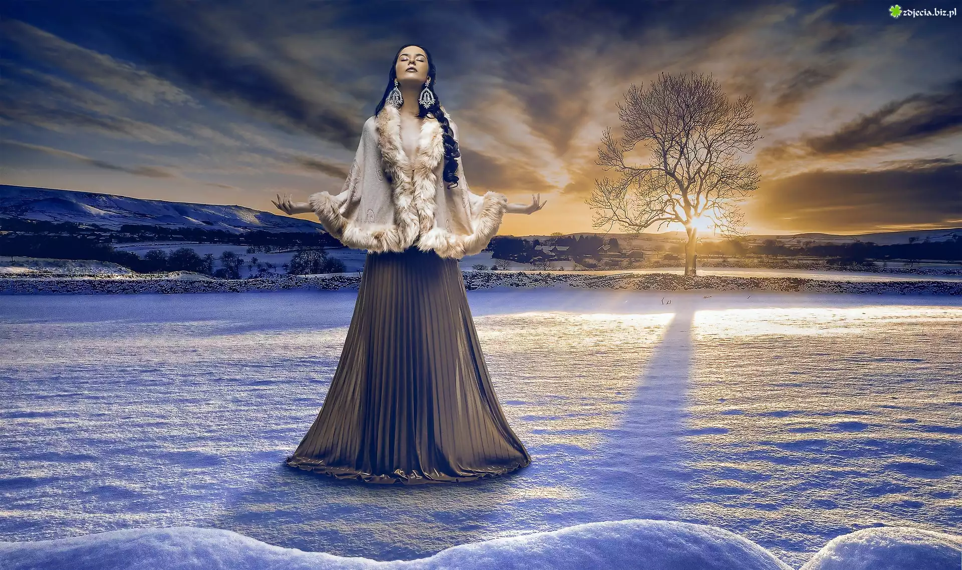 Zdjęcie Kobieta, Modelka, Zima, Zachód Słońca, Krajobraz