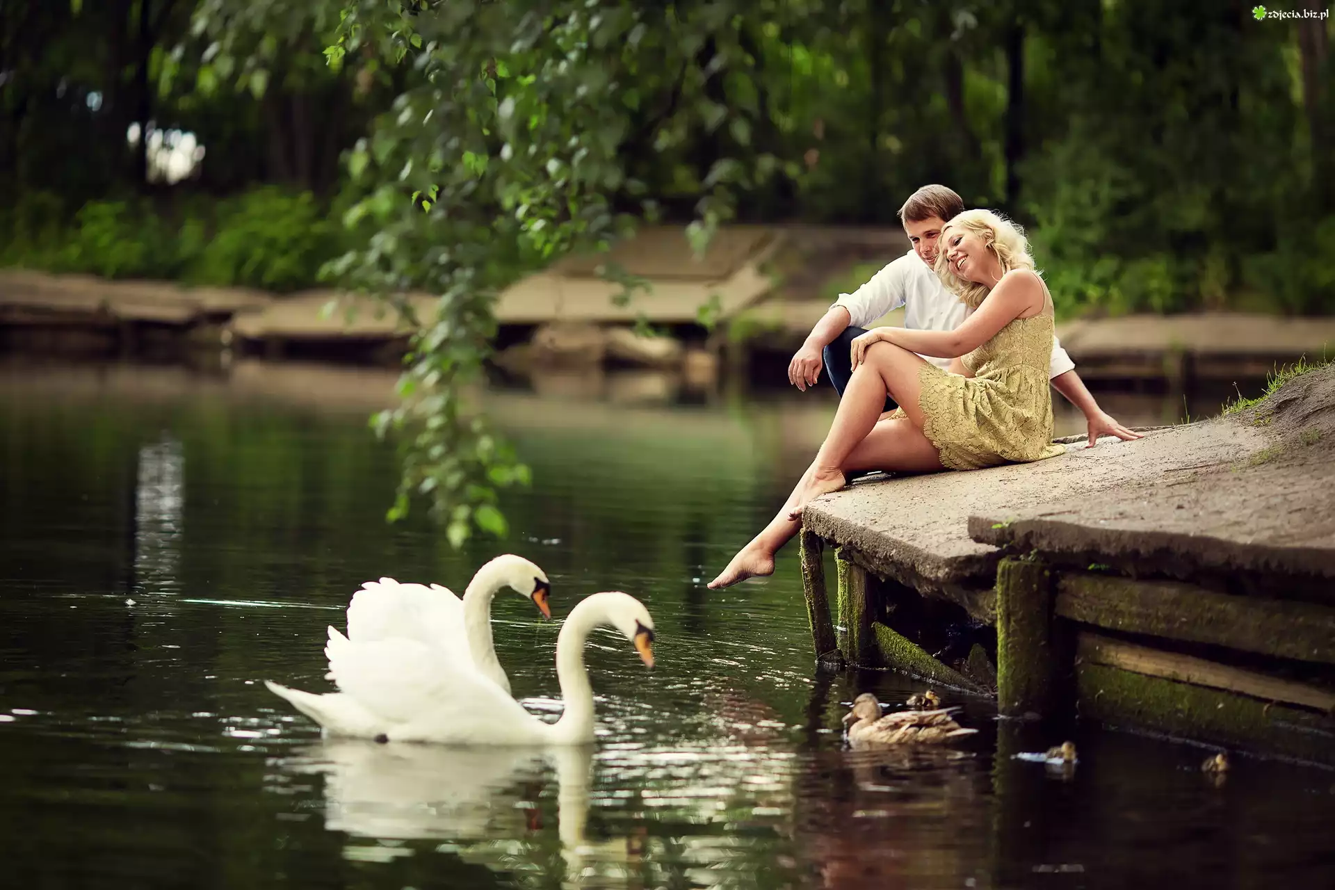 Zdjęcie Kobieta, Mężczyzna, Pomost, Staw, Łabędzie