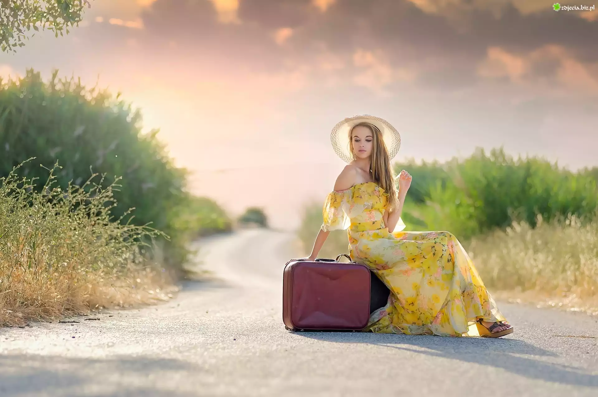 Zdjęcie Kobieta, Droga, Kapelusz, Sukienka, Walizka