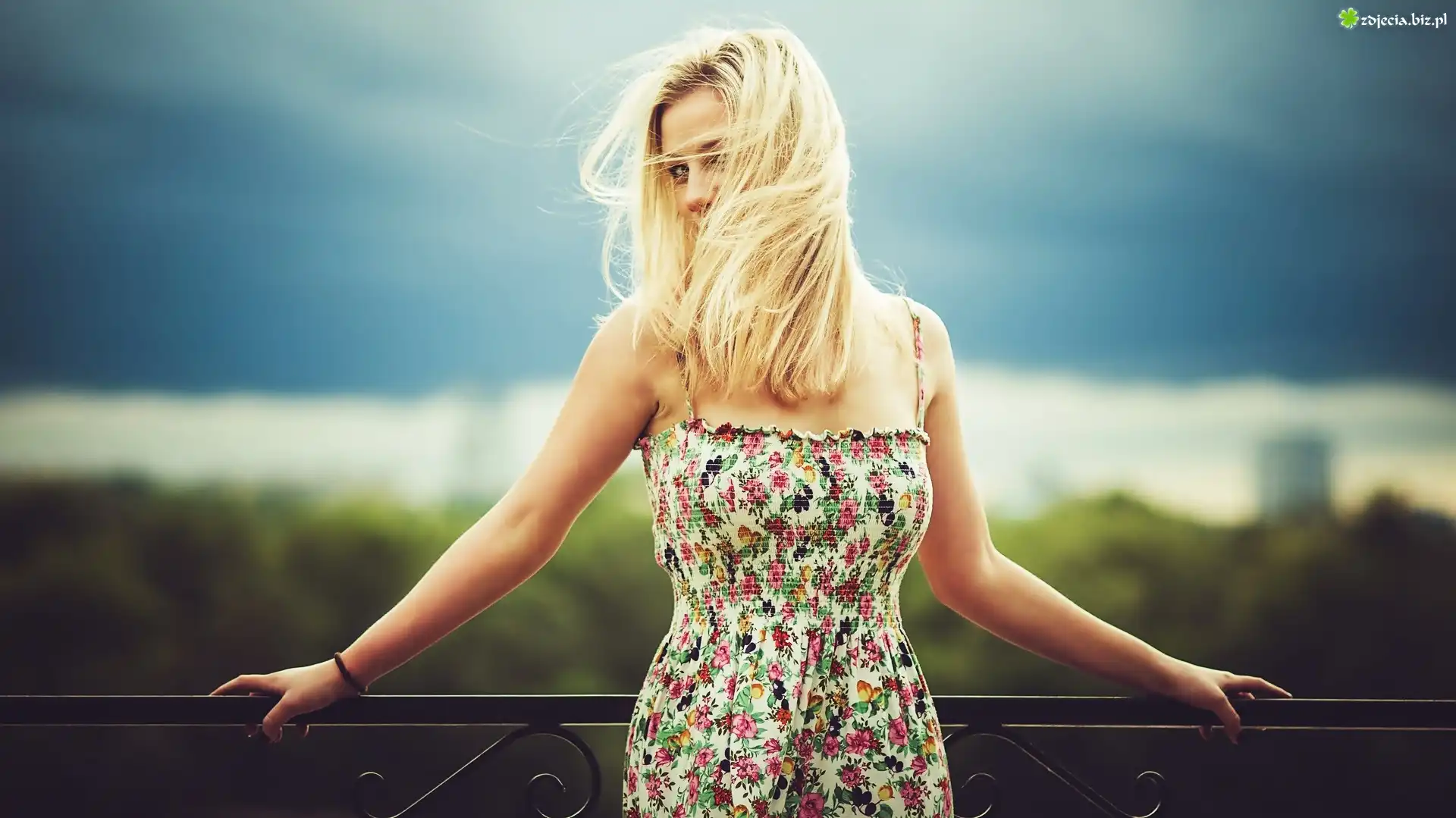Zdjęcie Kobieta, Blondynka, Kwiecista, Sukienka, Ogrodzenie