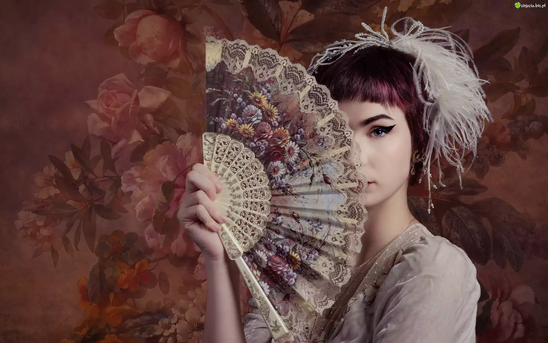 Zdjęcie Kobieta, Makijaż, Wachlarz, Tło, Kwiaty