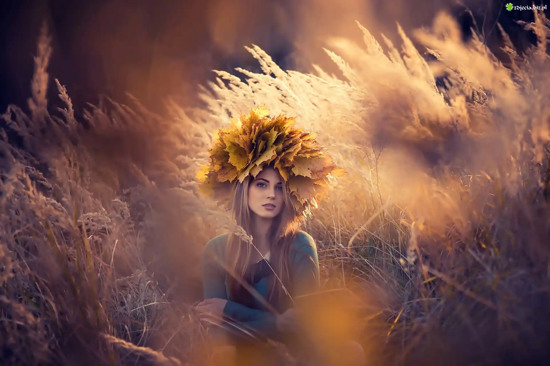 Zdjęcie Jesień, Kobieta, Twarz, Wianek, Liście, Klonu, Suche, Trawy