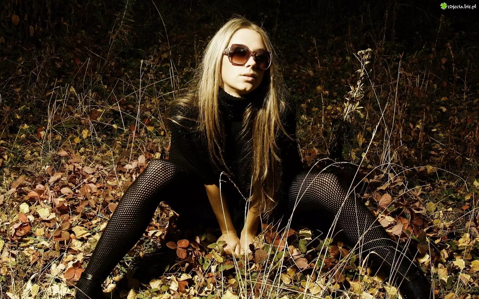 Zdjęcie Kobieta, Okulary, Liście, Suche, Trawy, Jesień
