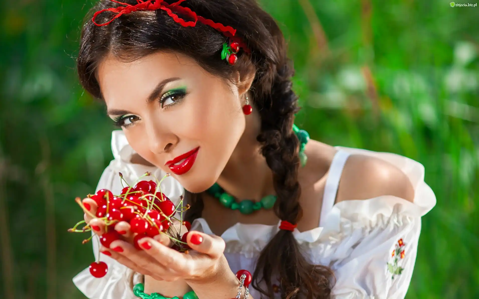 Zdjęcie Kobieta, Makijaż, Wiśnie, Ogród