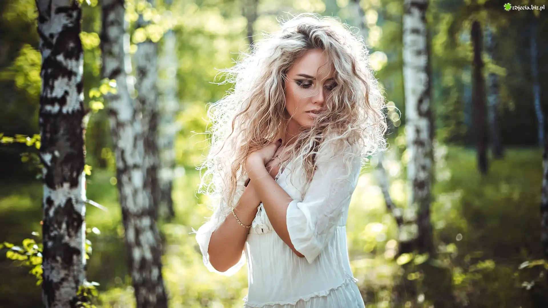 Zdjęcie Kobieta, Blondynka, Długie, Kręcone, Włosy, Las