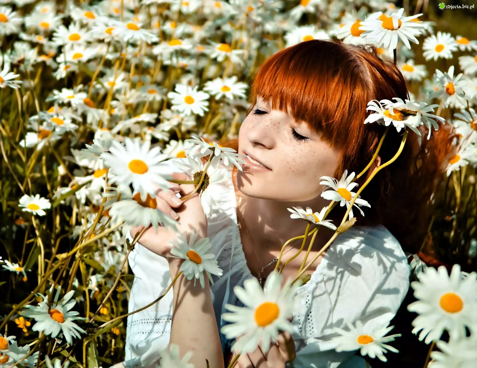 Zdjęcie Kobieta, Rude, Włosy, Margerytki