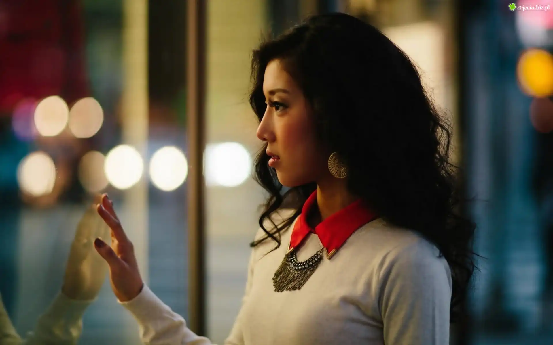 Zdjęcie, Zamyślona, Kobieta, Azjatka, Naszyjnik, Makijaż, Okno, Blask