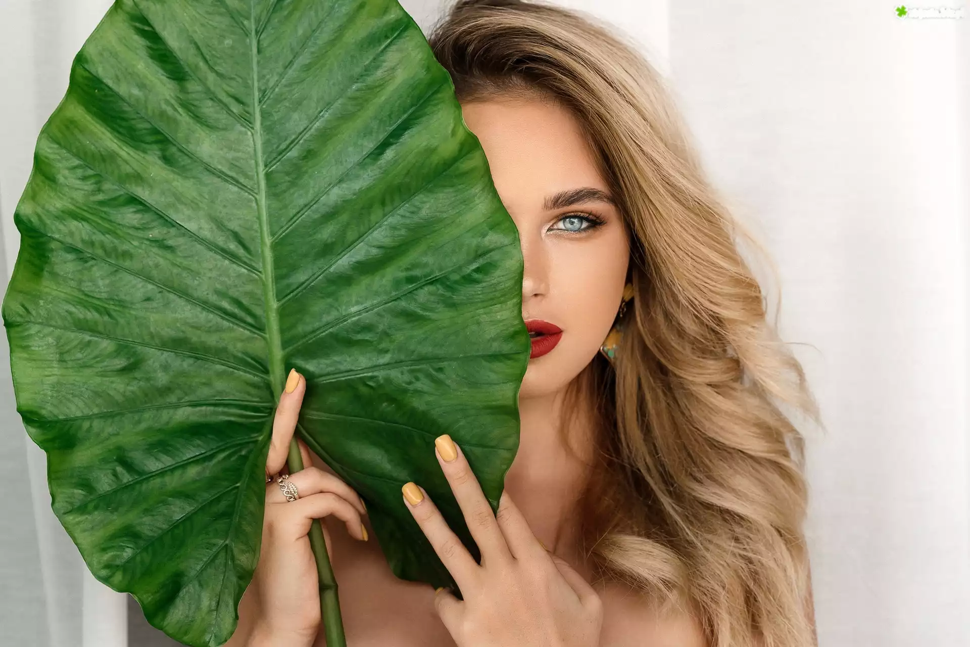 Zdjęcie Kobieta, Blondynka, Zielony, Liść