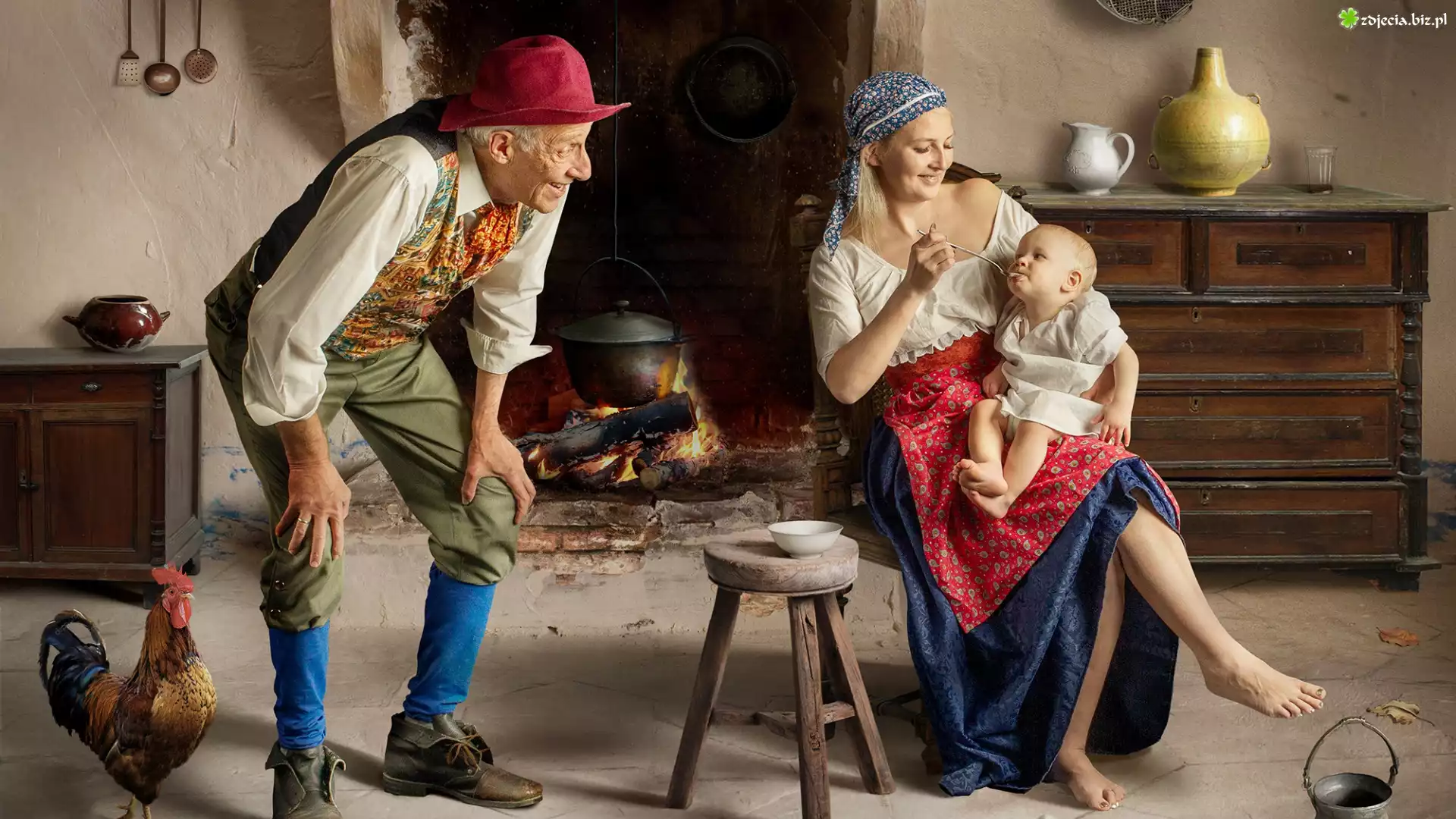 Zdjęcie Ludzie, Kobieta, Mężczyzna, Dziadek, Mama, Dziecko, Niemowlę, Izba, Kogut