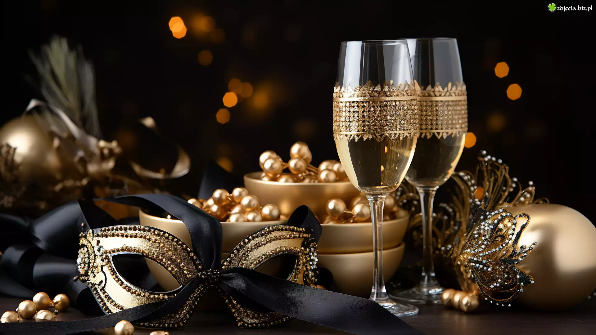 Zdjęcie, Kieliszki, Szampan, Maska, Kokarda, Bombka, Kompozycja