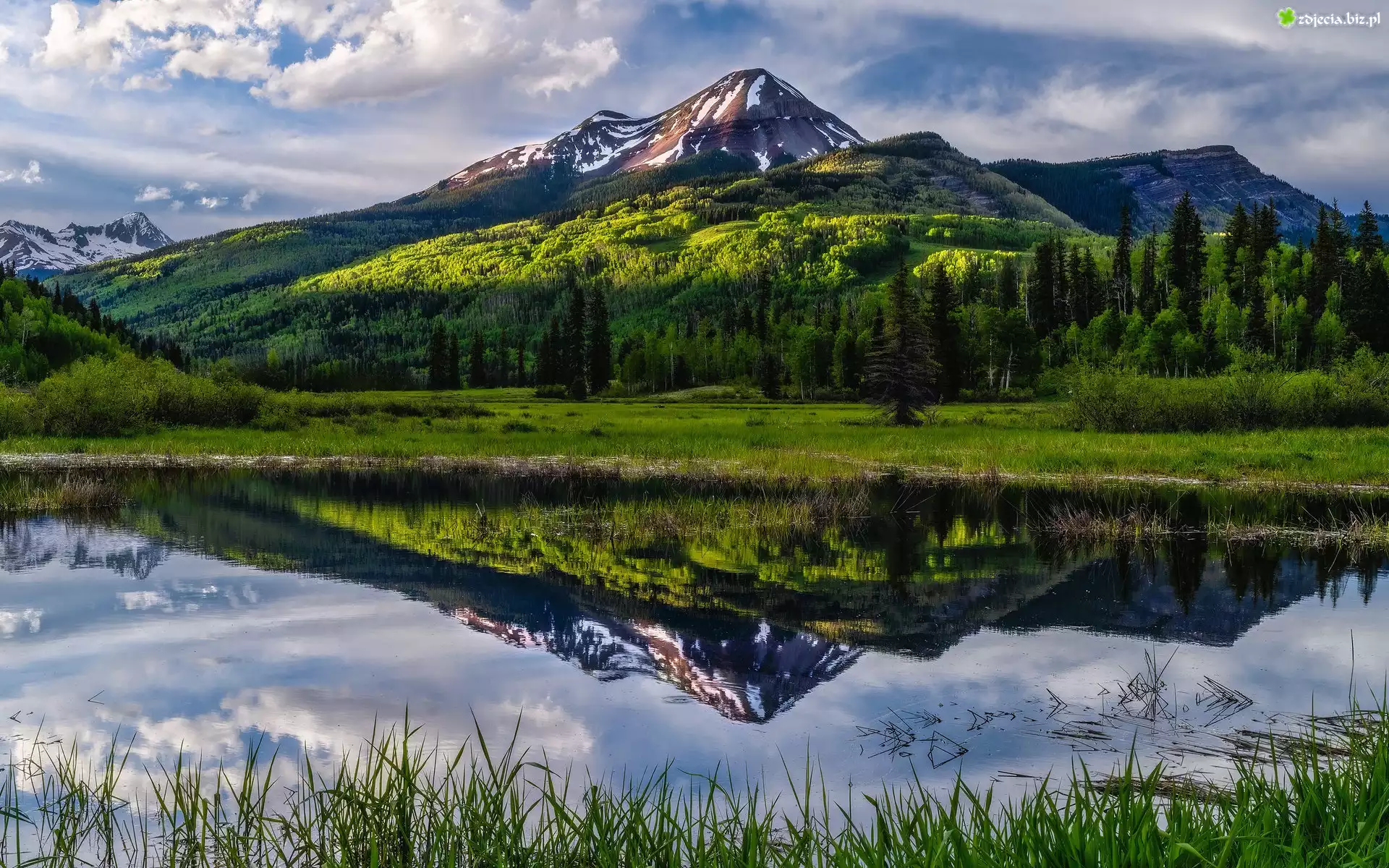 Zdjęcie Góry, San Juan Mountains, Jezioro, Drzewa, Chmury, Odbicie, Stan Kolorado, Stany Zjednoczone |