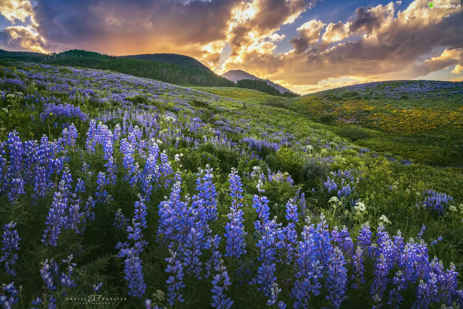 Zdjęcie Stany Zjednoczone, Stan Kolorado, Góry, Elk Mountains, Łąka, Niebieskie, Łubiny, Zachód słońca, Chmury |