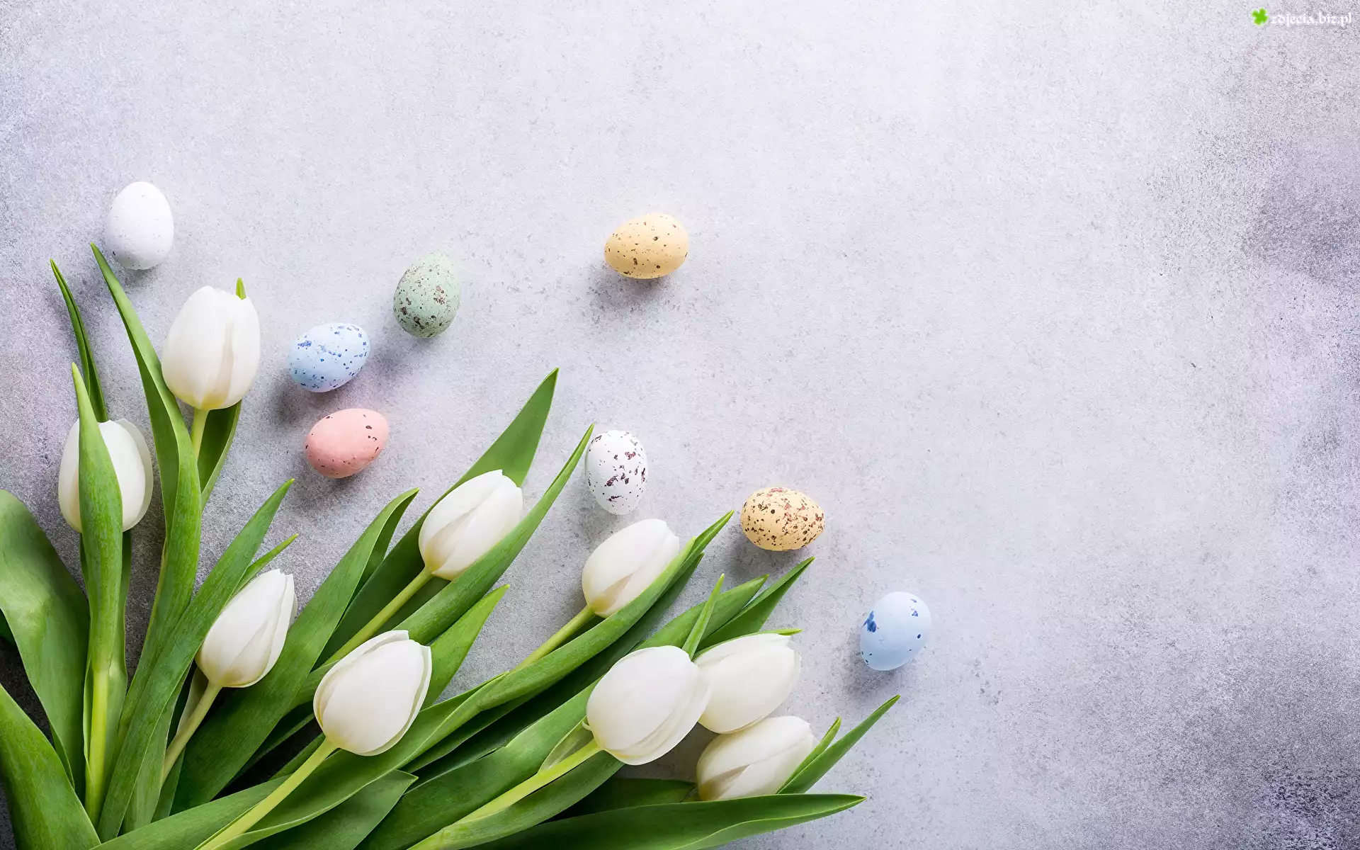 Zdjęcie, Wielkanoc, Tulipany, Białe, Kolorowe, Pisanki, Szare tło