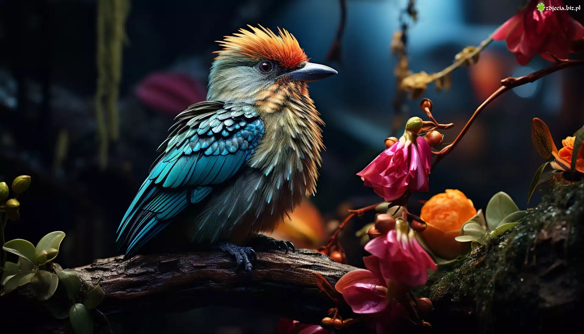 Zdjęcie Kolorowy, Ptak, Gałąź, Kolorowe, Kwiaty, Grafika