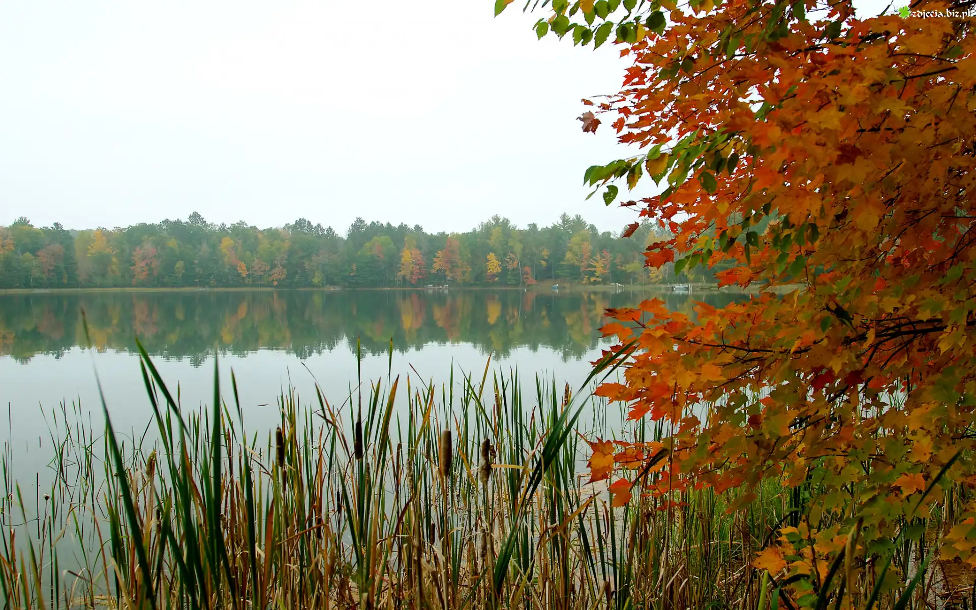 Zdjęcie Kolorowe, Drzewo, Gałęzie, Liście, Jezioro, Tatarak