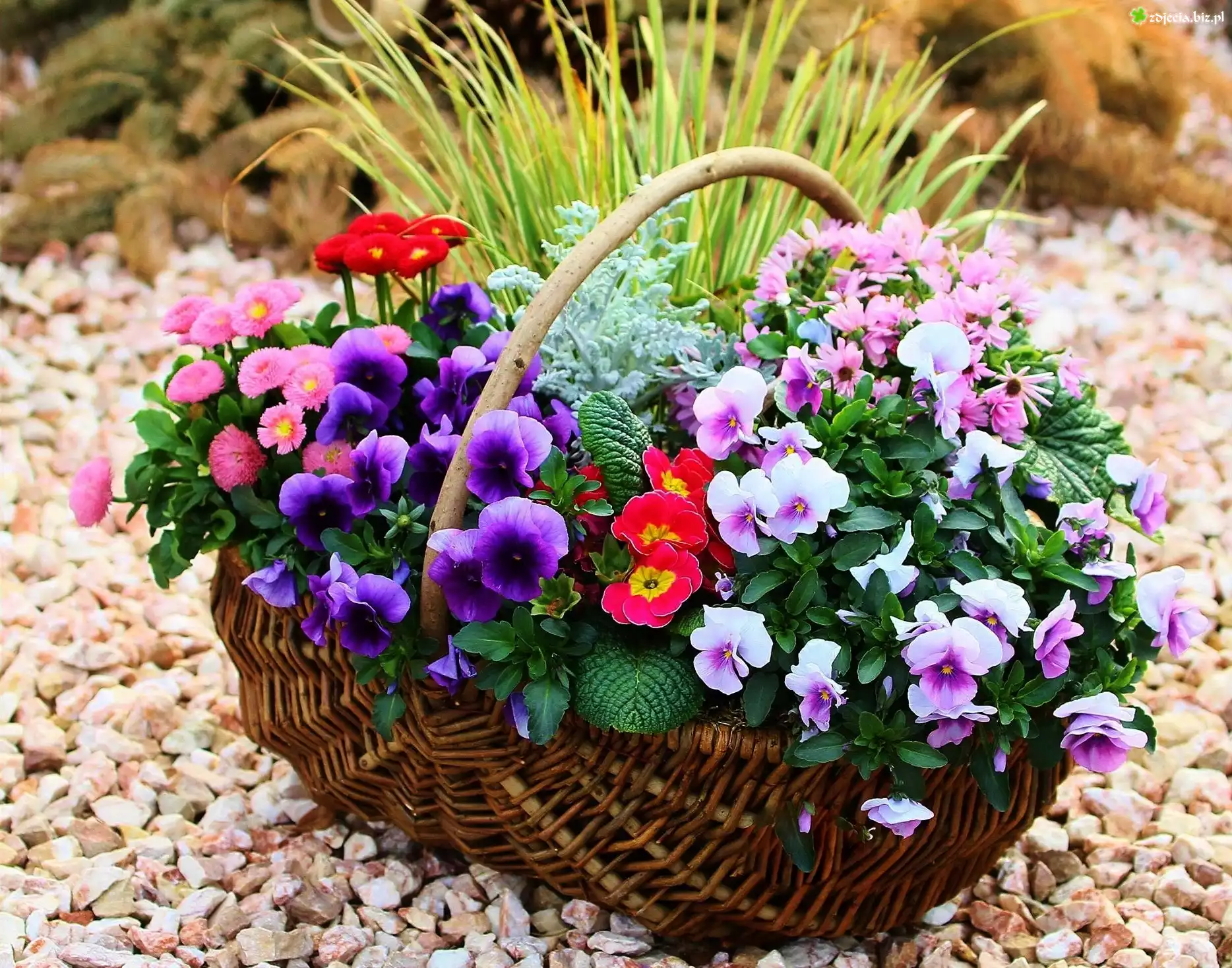 Zdjęcie Kolorowe, Kwiaty, Koszyk, Kamyki