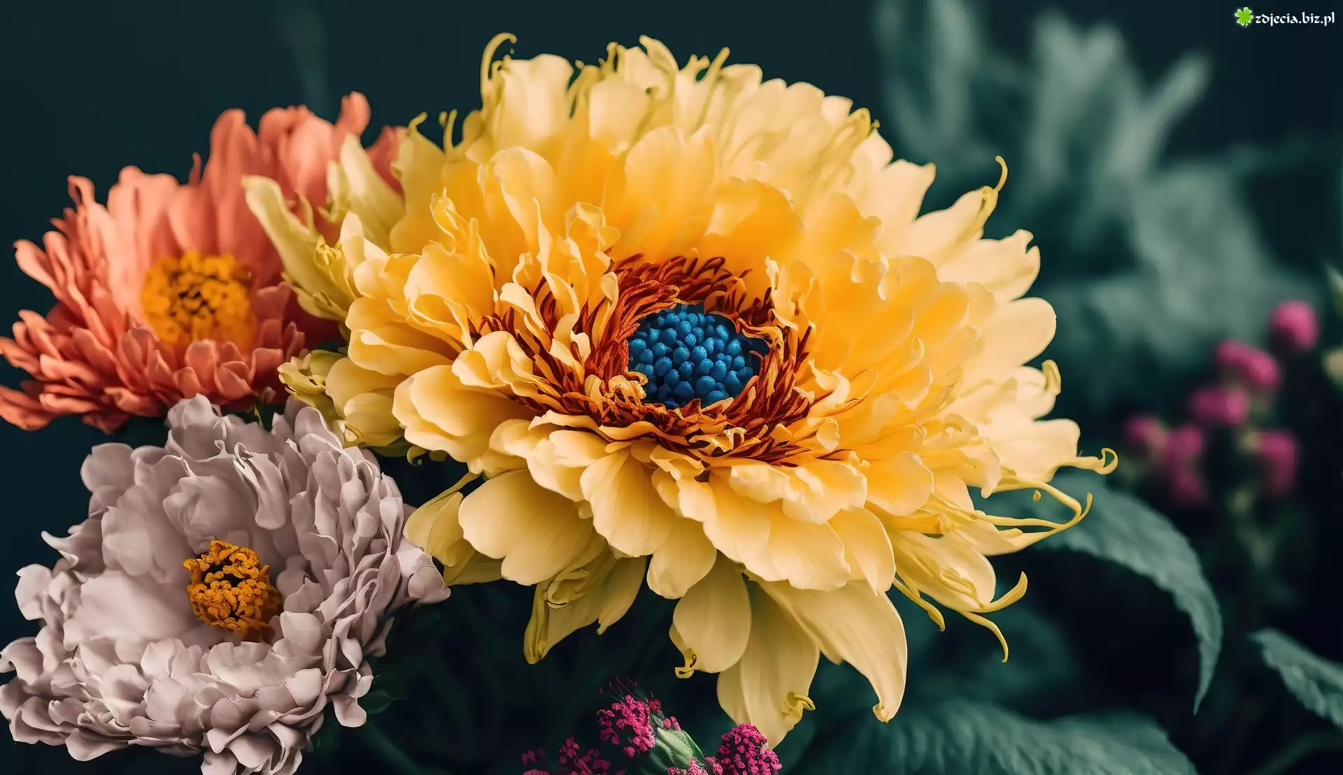 Zdjęcie Trzy, Kolorowe, Kwiaty, Liście, Grafika