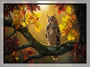 Zdjęcie, Ptak, Sowa uszata, Drzewo, Dąb, Gałązka, Kolorowe, Liście, Jesień Sowa Uszata