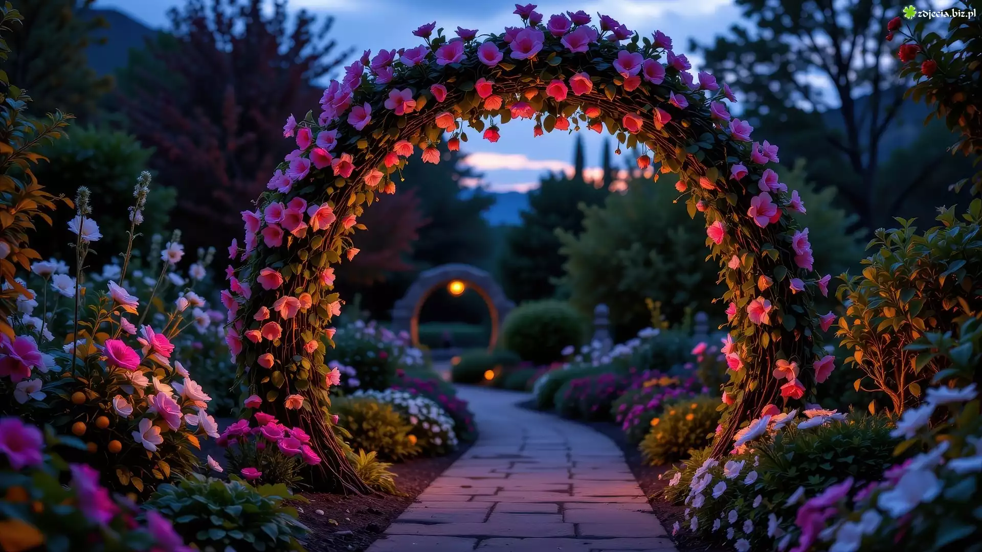 Zdjęcie Ogród, Kwiatowy, Łuk, Kolorowe, Kwiaty, Drzewa, Alejka