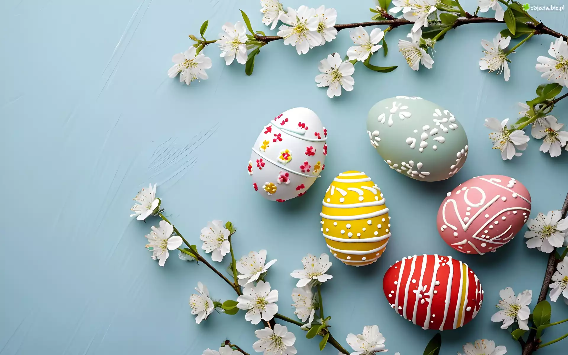Zdjęcie Kolorowe, Pisanki, Gałązki, Białe, Kwiaty, Listki, Niebieskie, Tło, Wielkanoc
