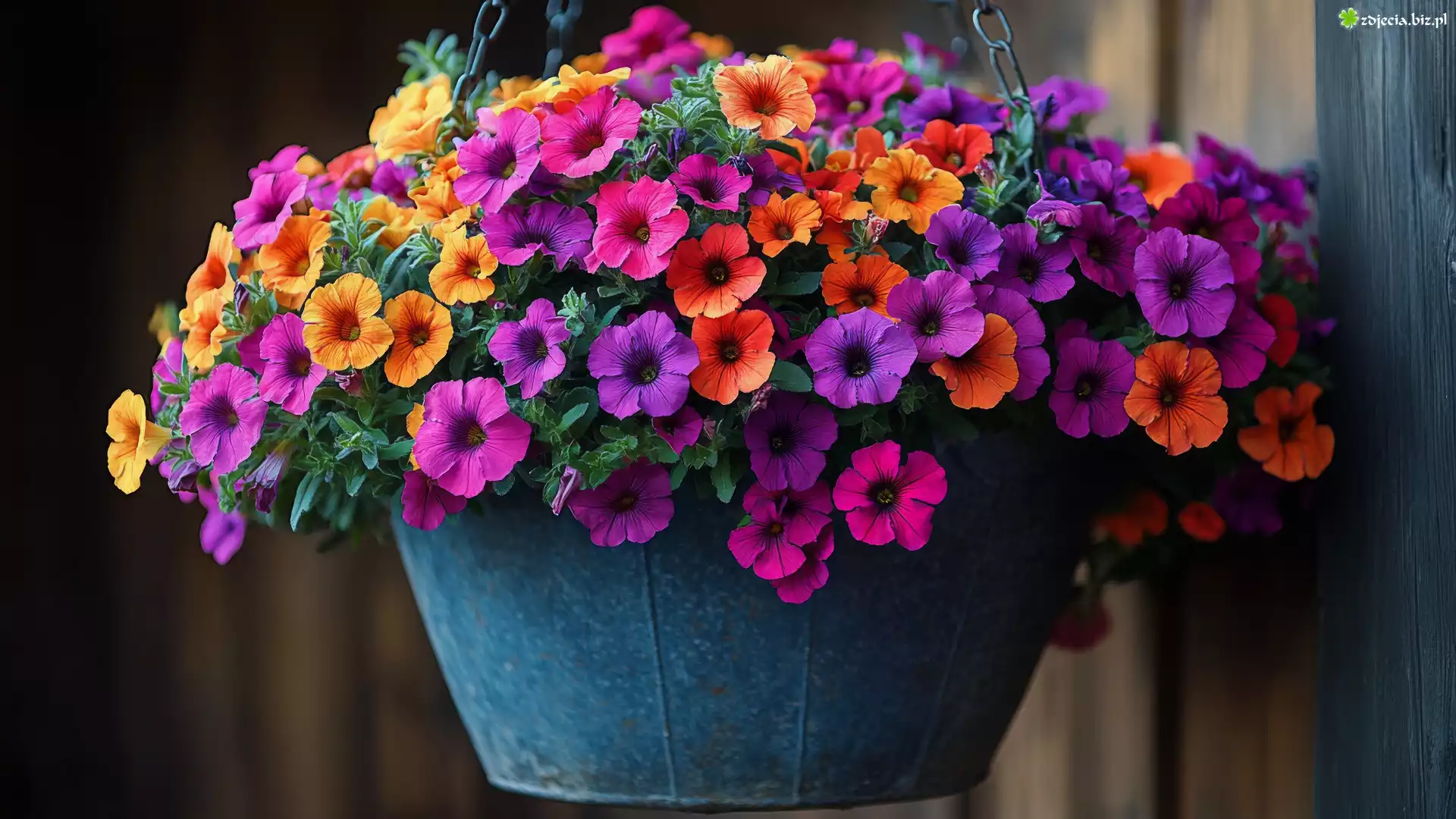 Zdjęcie Kwiaty, Kolorowe, Petunie, Wisząca, Doniczka