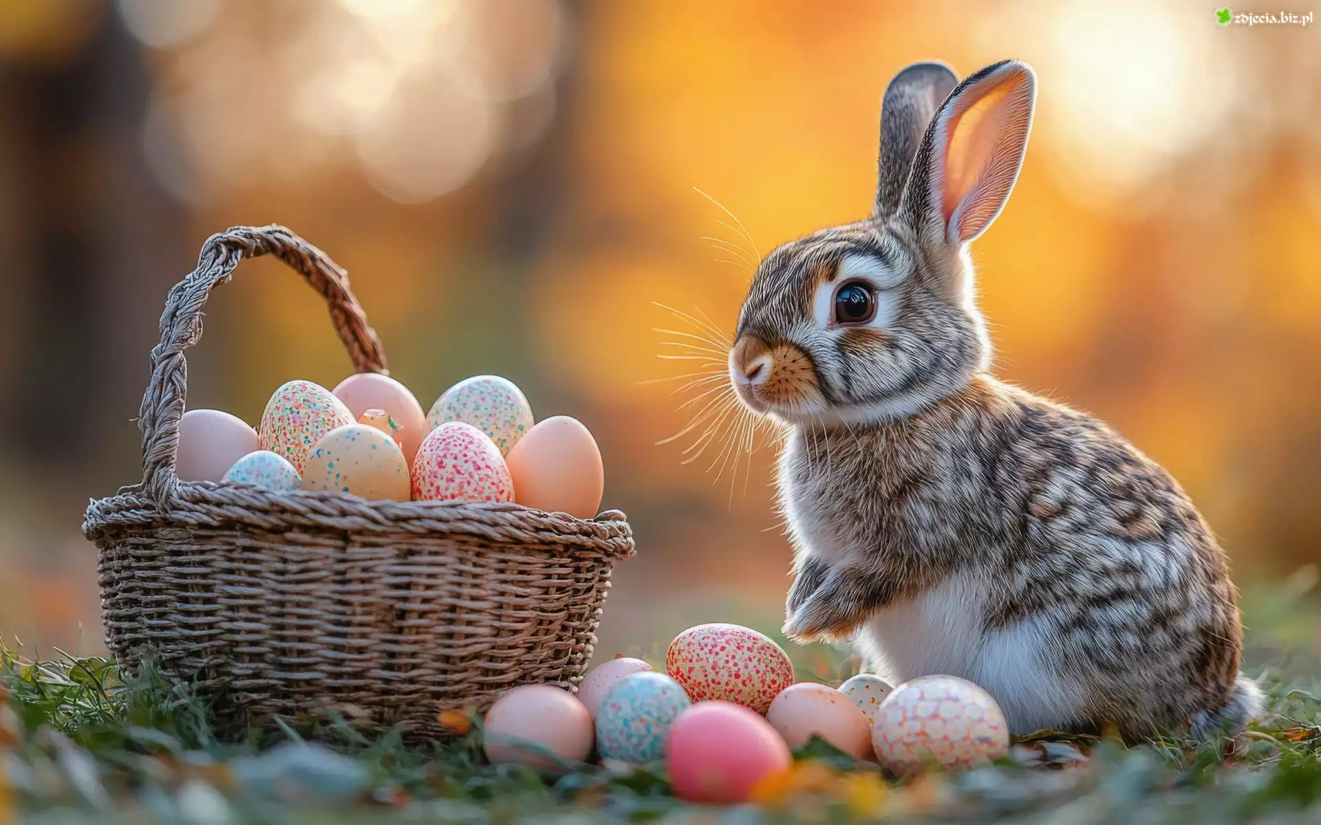 Zdjęcie Wielkanoc, Królik, Koszyk, Kolorowe, Pisanki, Światło