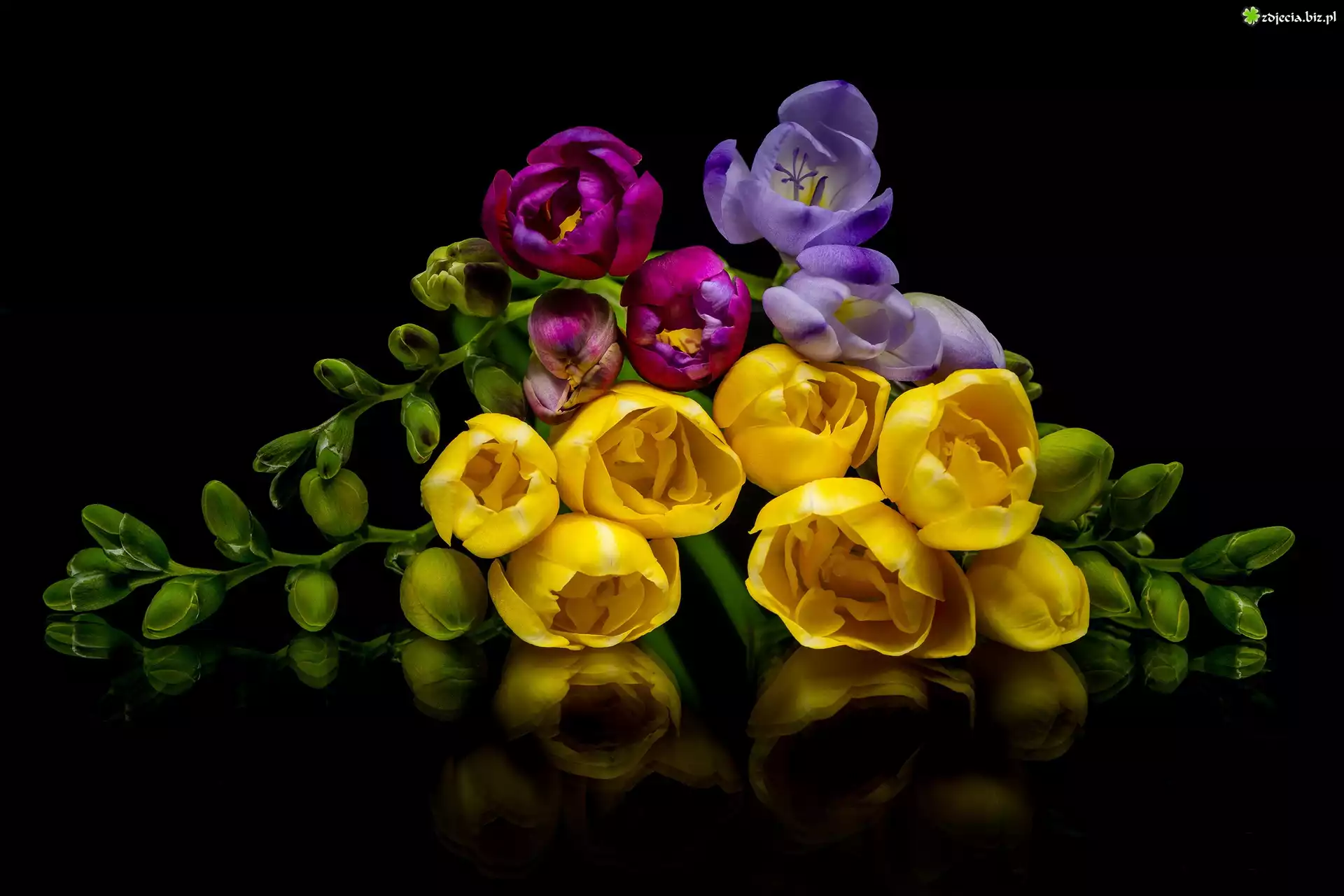 Zdjęcie Kolorowe, Frezje, Czarne tło, Odbicie