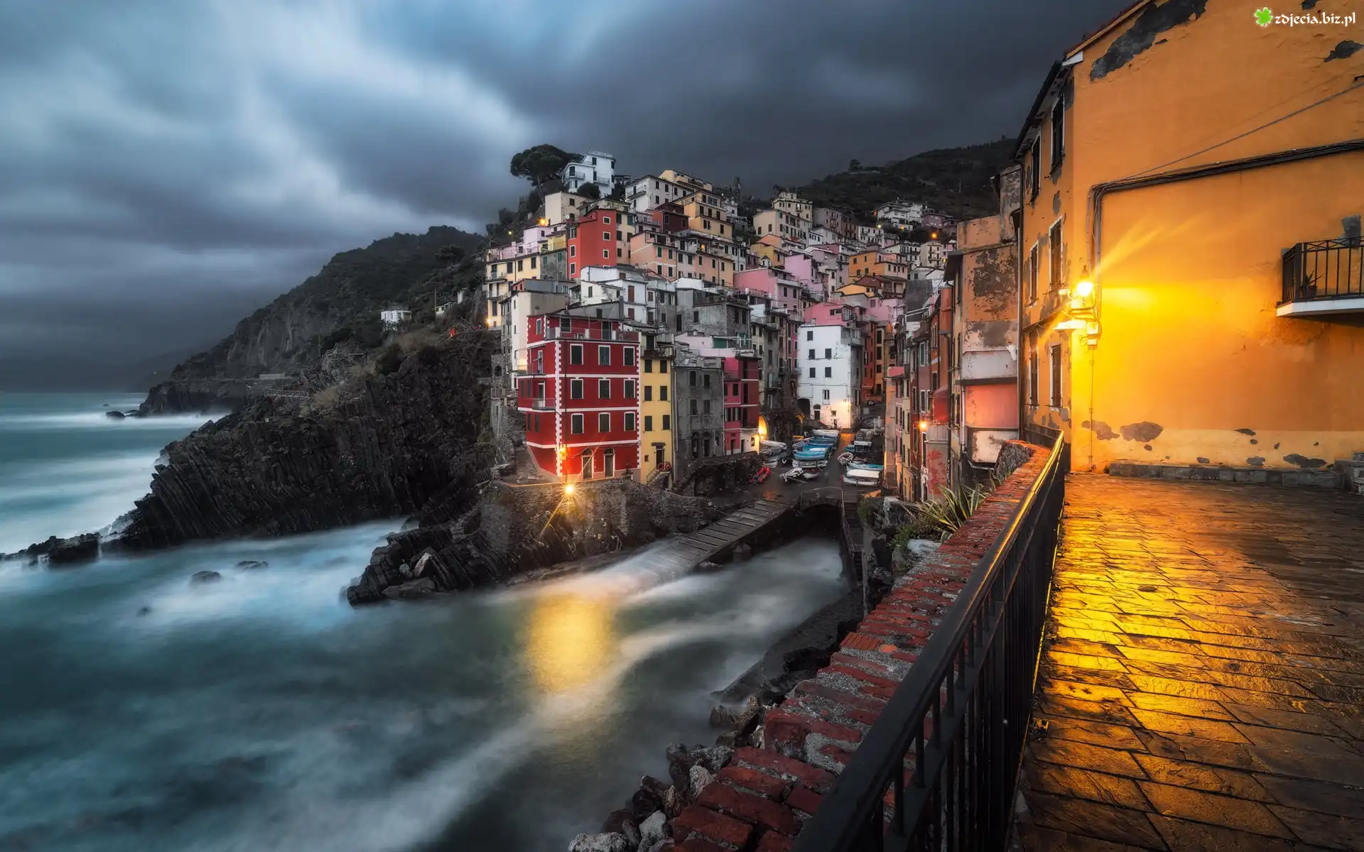 Zdjęcie Włochy, Cinque Terre, Miejscowość, Riomaggiore, Kolorowe, Domy, Morze, Skały, Zatoka, Światła, Noc |