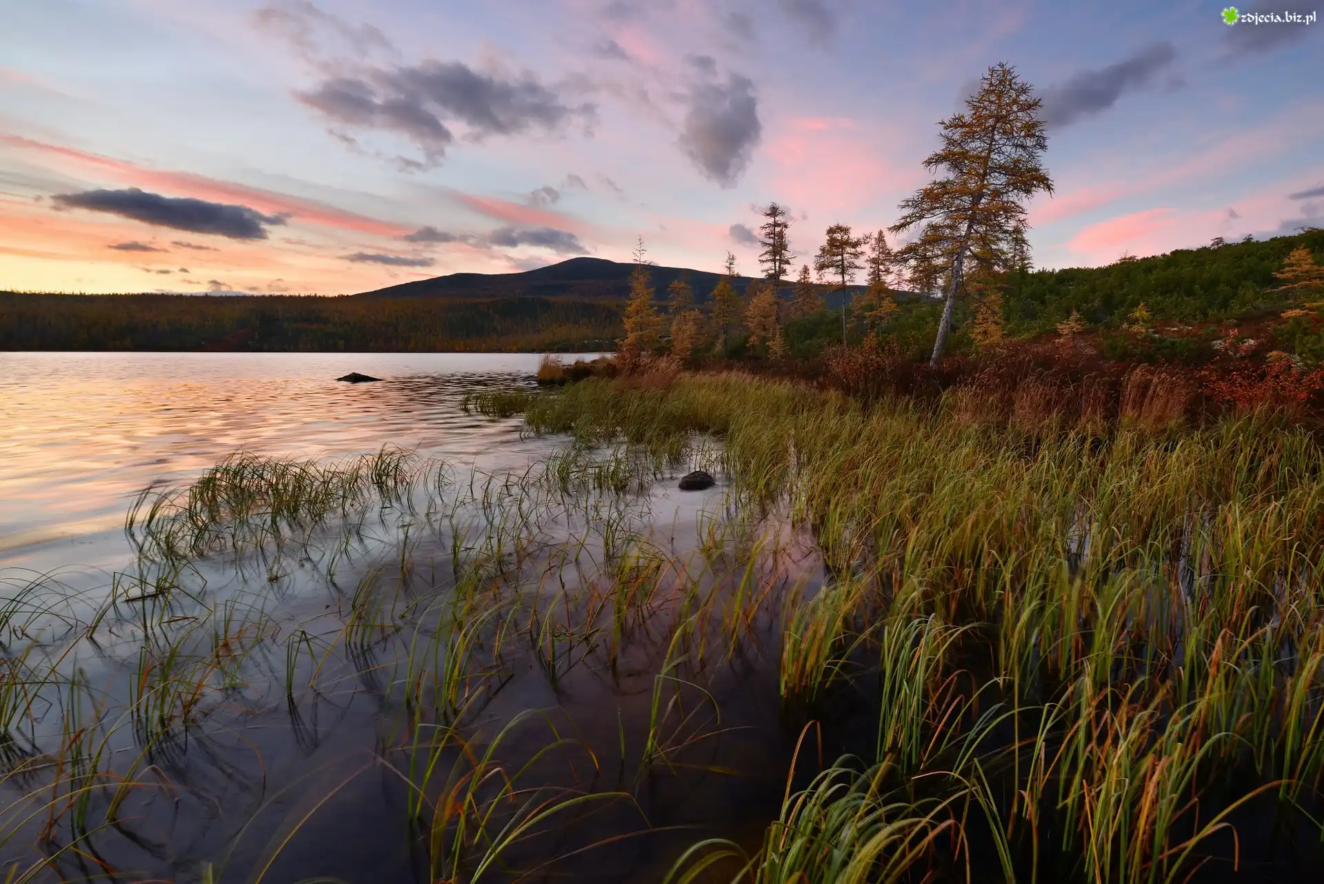 Zdjęcie Jezioro Jack London, Góry Kołymskie, Trawa, Drzewa, Chmury, Wschód słońca, Kołyma, Obwód magadański, Rosja |