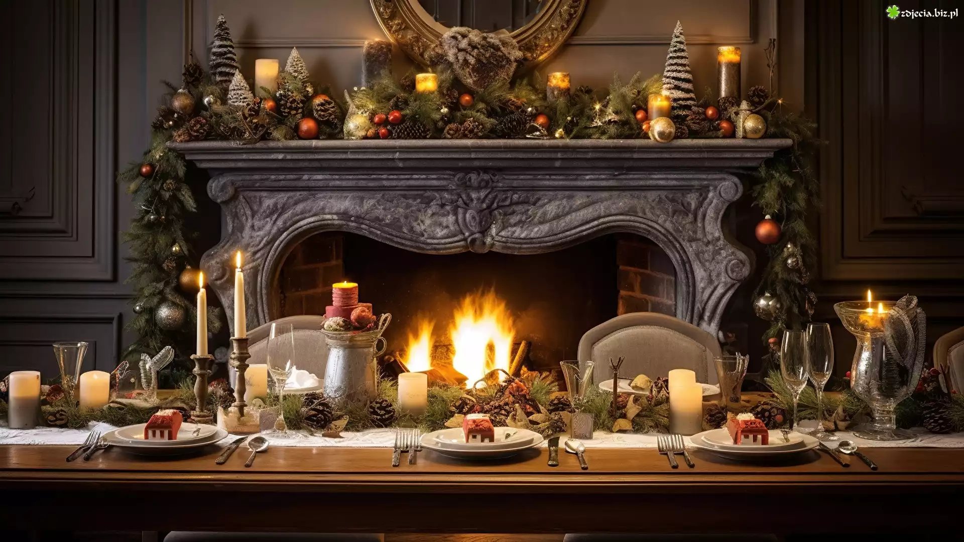 Zdjęcie Kominek, Bombki, Świece, Ogień, Stół, Talerze, Ciasto, Sztućce, Szyszki