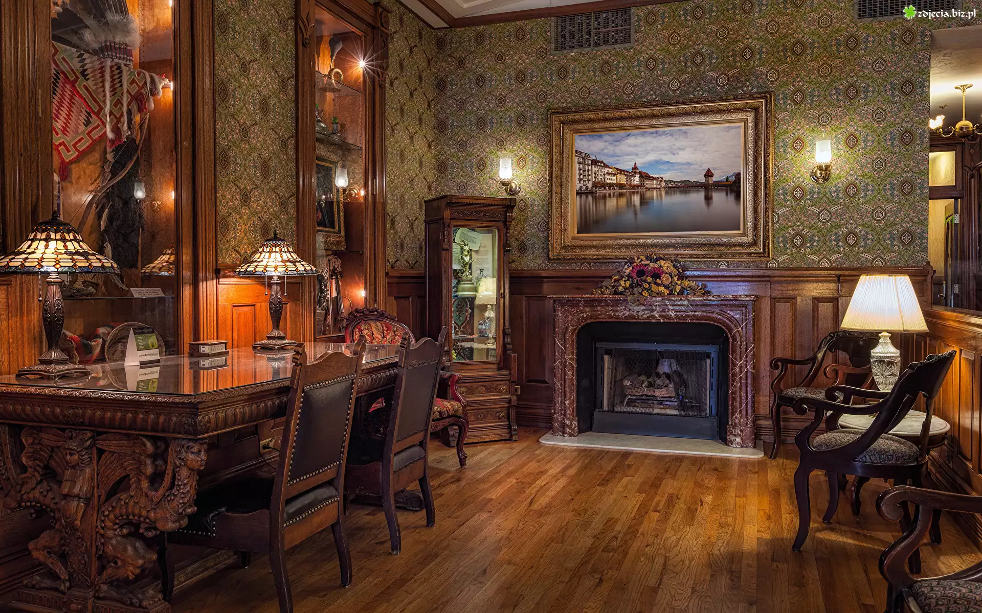 Zdjęcie Pokój, Stół, Krzesła, Kominek, Lampy, Obraz