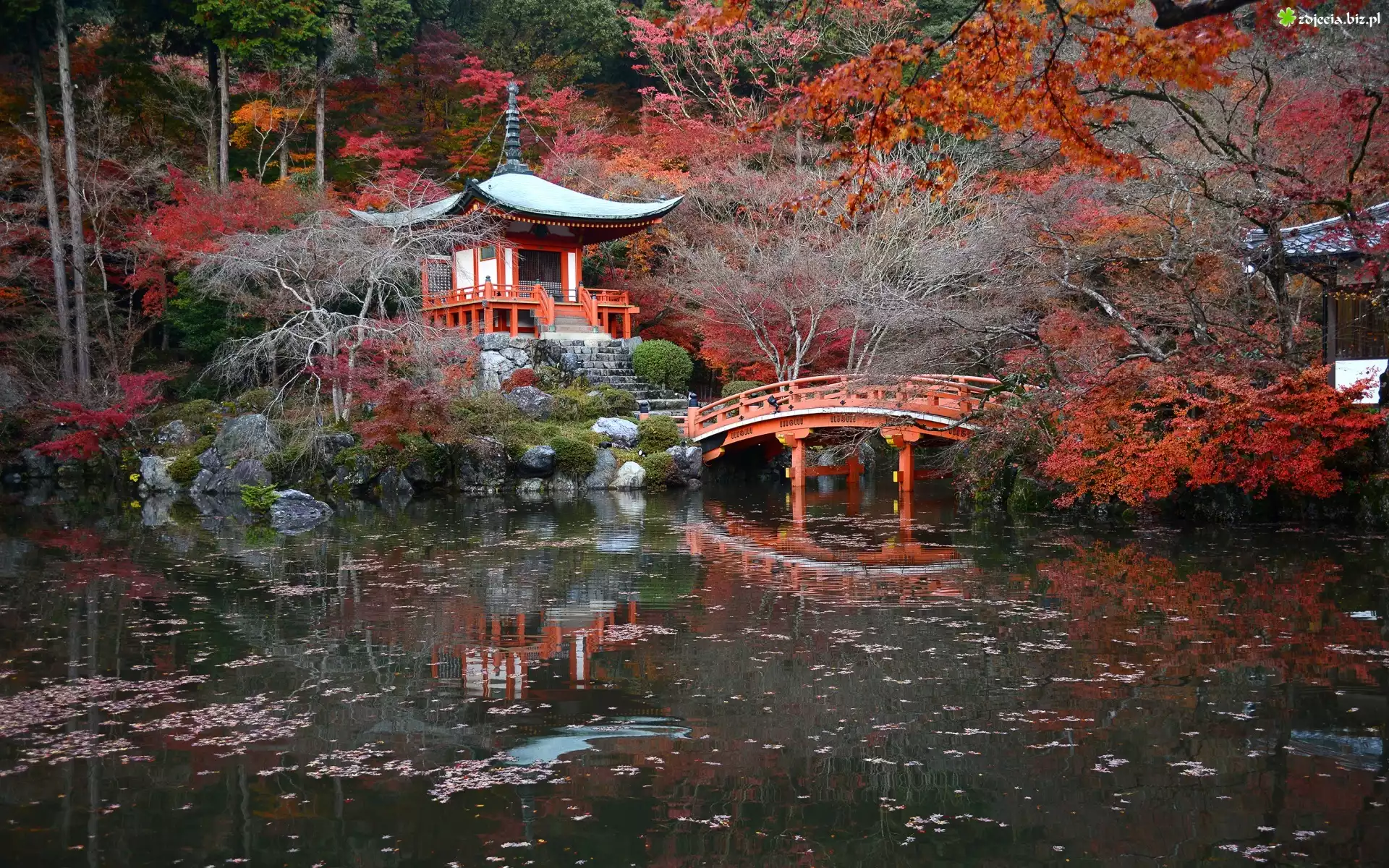 Zdjęcie Kompleks świątynny Daigo-ji, Świątynia Benten-do, Mostek, Staw, Jesień, Drzewa, Kioto, Japonia |