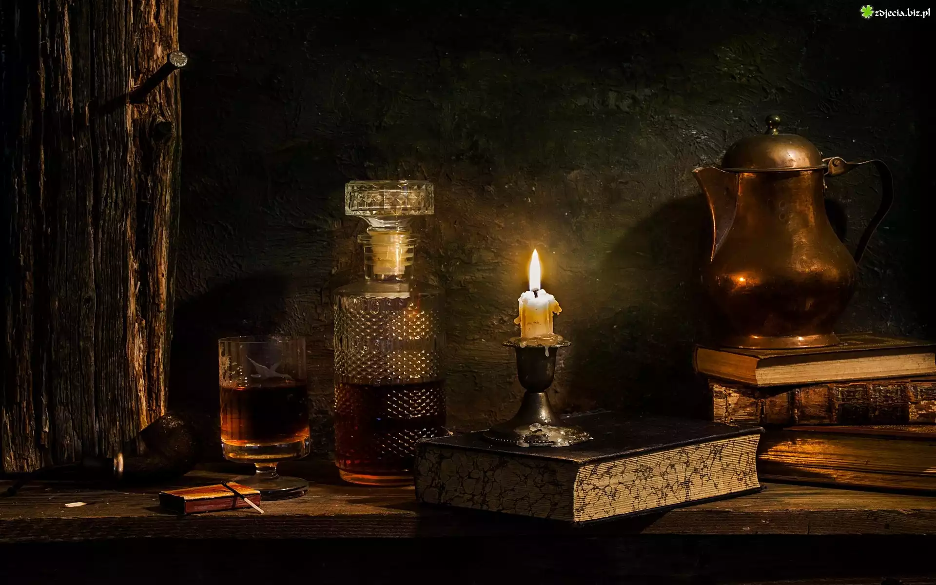 Zdjęcie Kompozycja, Świeca, Książki, Karafka, Alkohol, Koniak