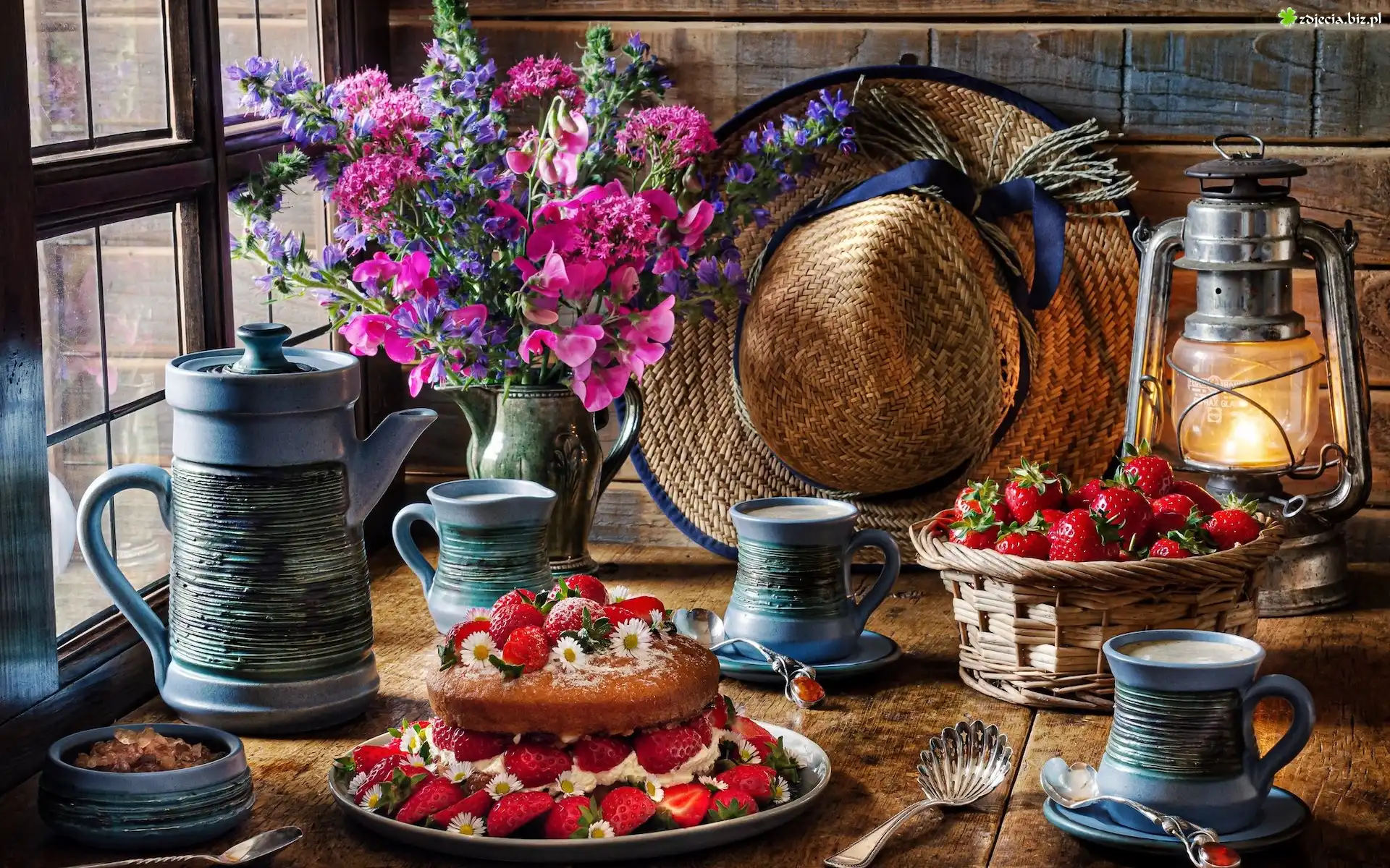 Zdjęcie Kompozycja, Okno, Bukiet kwiatów, Kapelusz, Lampa, Ciasto, Truskawki, Dzbanek, Kubki